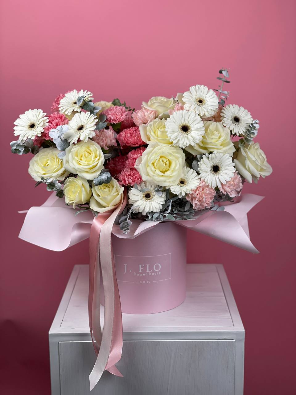 белые розы, диантусы, герберы, эвкалипт, бокс 20.