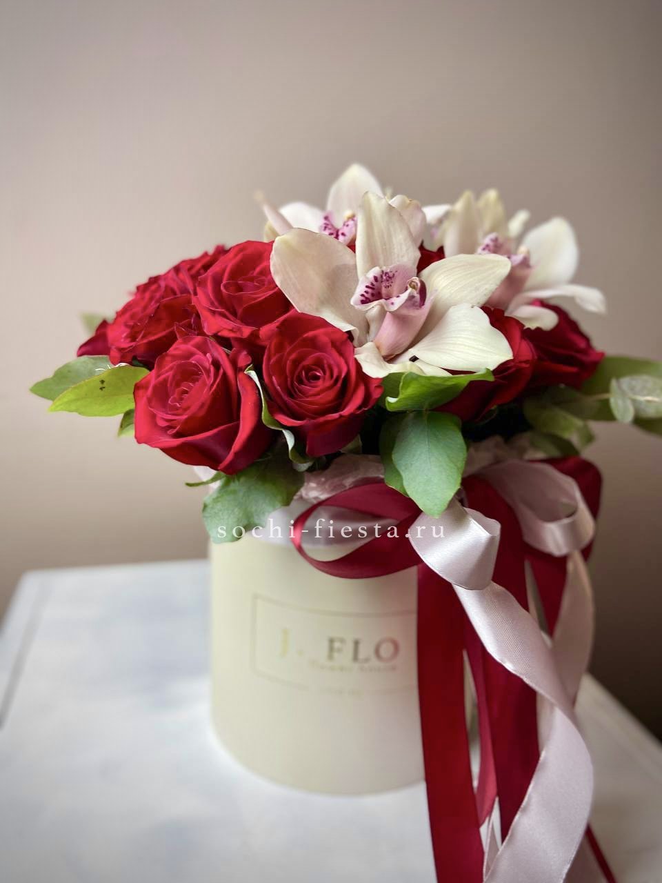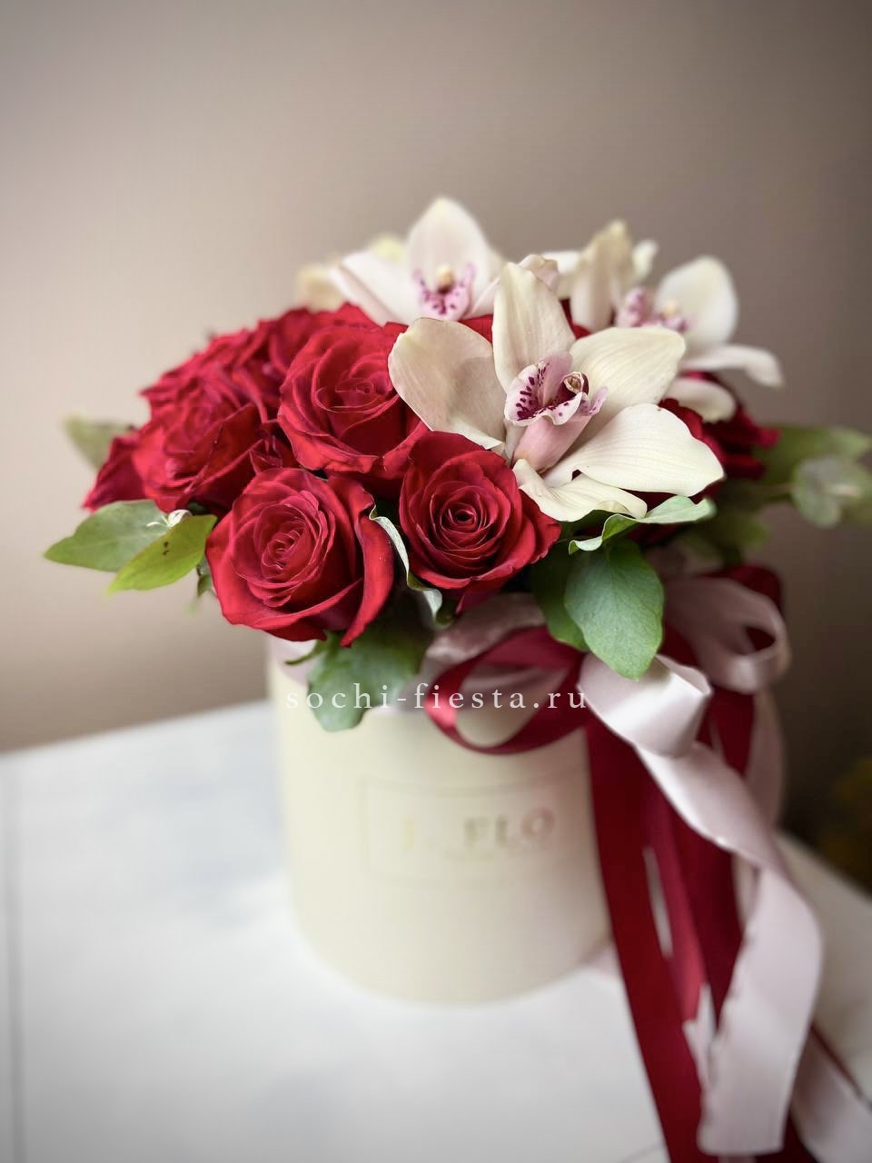 Красные розы и белые цимбидиумы собраны в круглом боксе с атласной лентой. Плотная укладка бутонов создаёт насыщенную композицию, где каждый цветок виден и различим. Классика флористики в удобном формате.