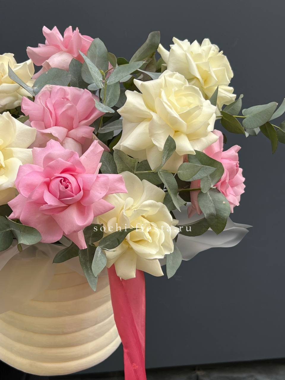 Семнадцать французских роз в пастельном миксе собраны в круглую форму. Композиция компактна и выразительна благодаря сочной зелени эвкалипта.