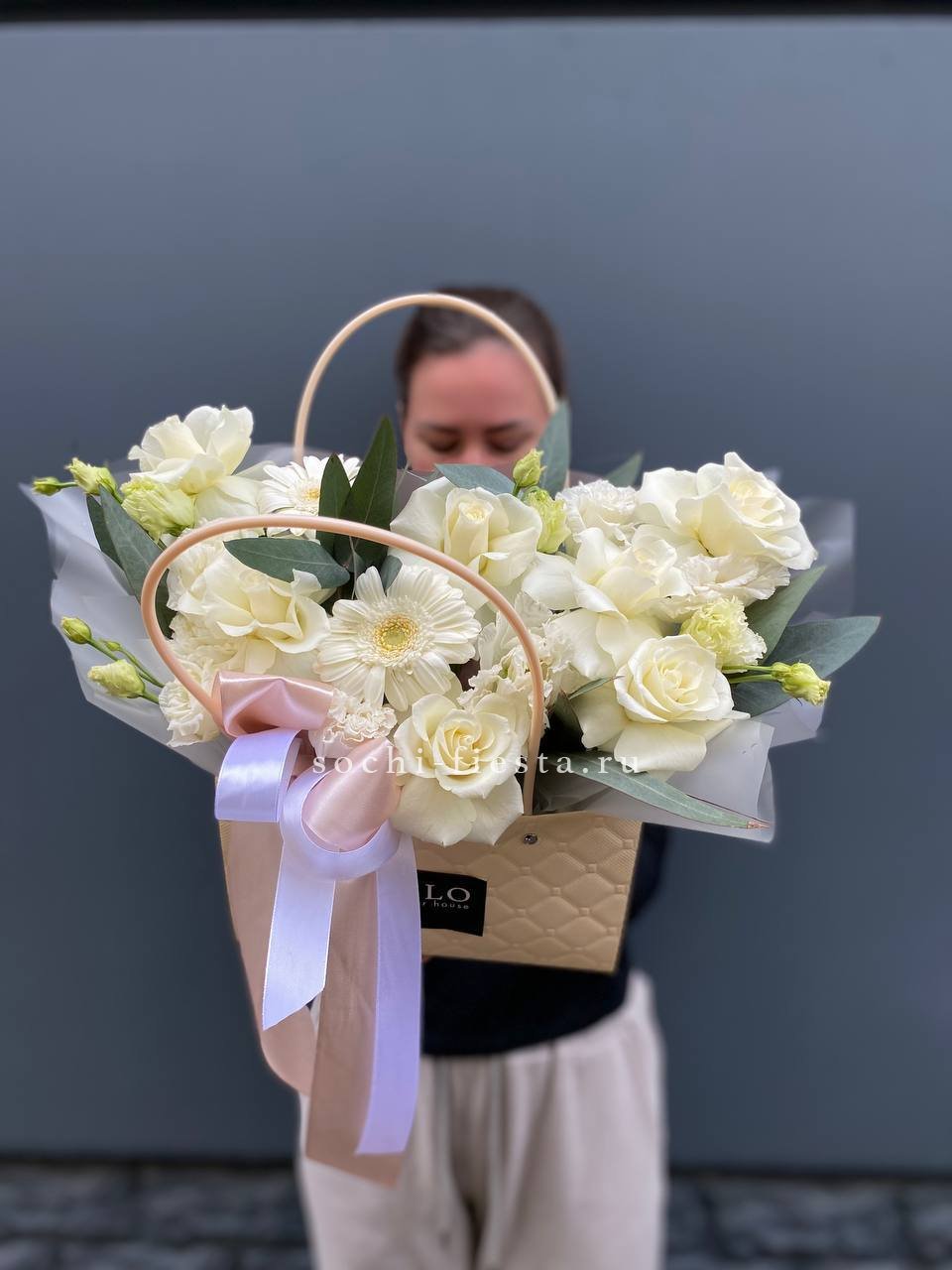 Пышные головки пионовидных роз задают объём, а мелкие соцветия диантуса разбивают плотность. Гортензия добавляет воздушную текстуру, эвкалипт смягчает линии. Композиция в сумке-кашпо выглядит свободно и живо.