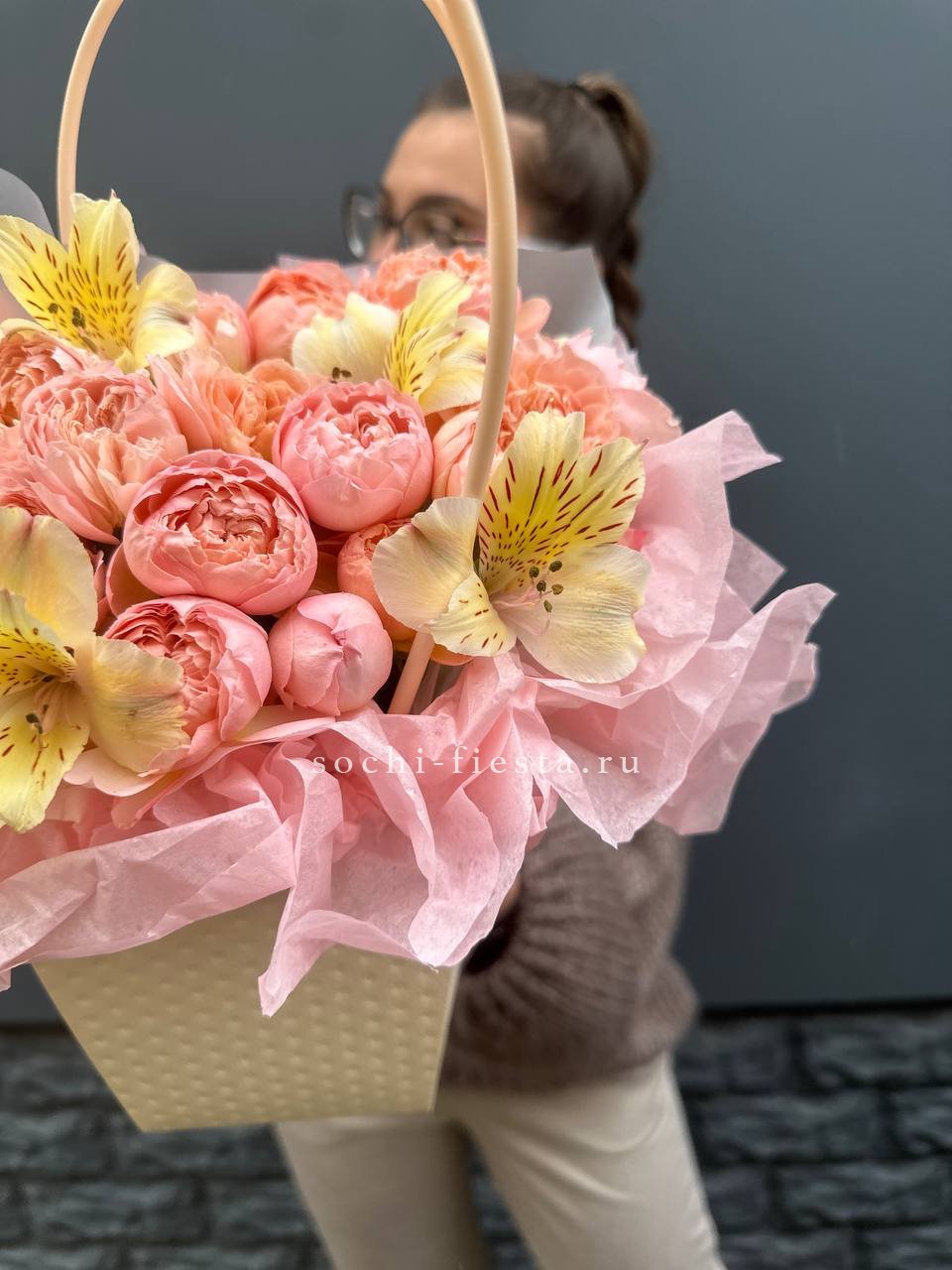 Пионовидные розы Джульетта и яркие альстромерии собраны в компактную сумочку с лентой. Округлые бутоны создают мягкий объем, а формат позволяет разместить композицию на столе или полке.