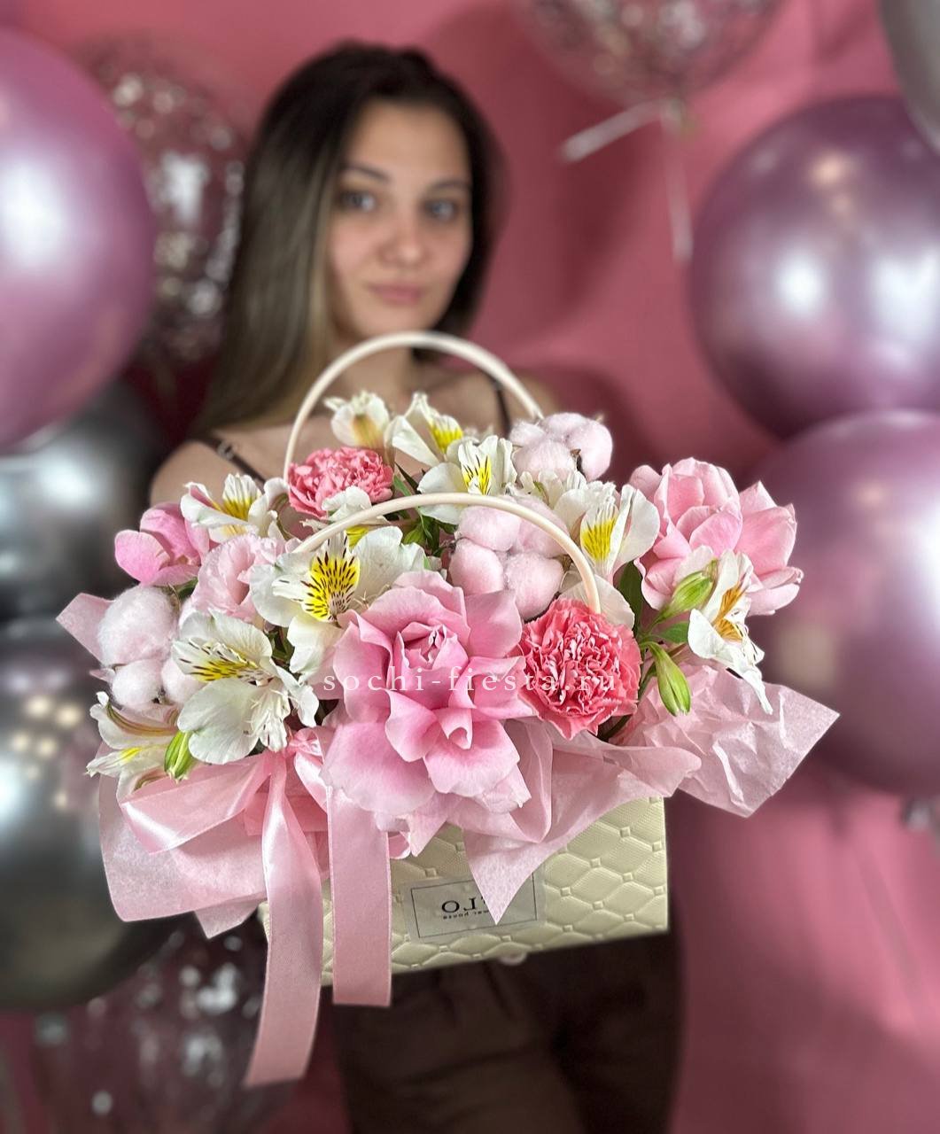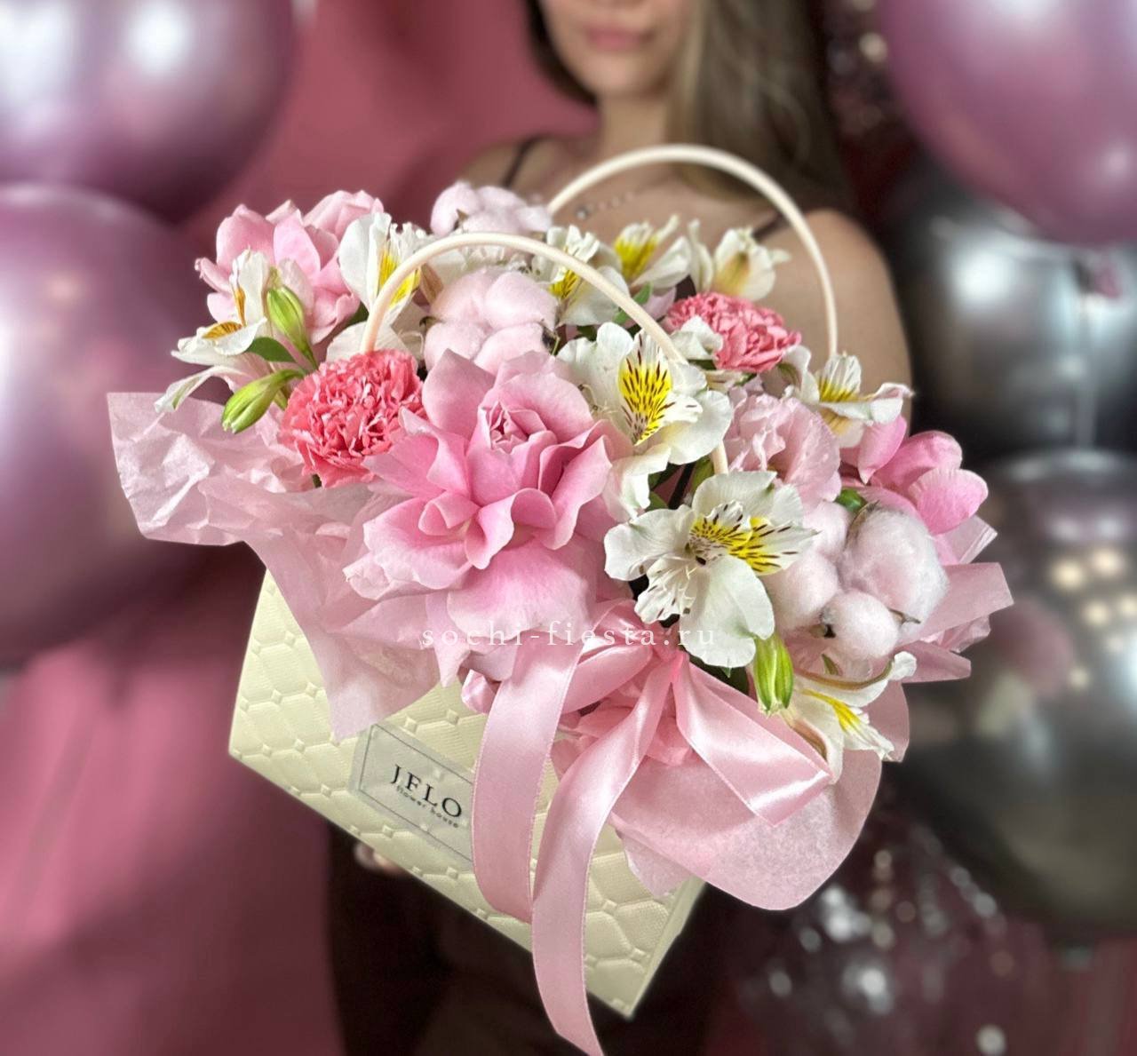 пионовидные кустовые розы, альстромерии, сумочка, лента.