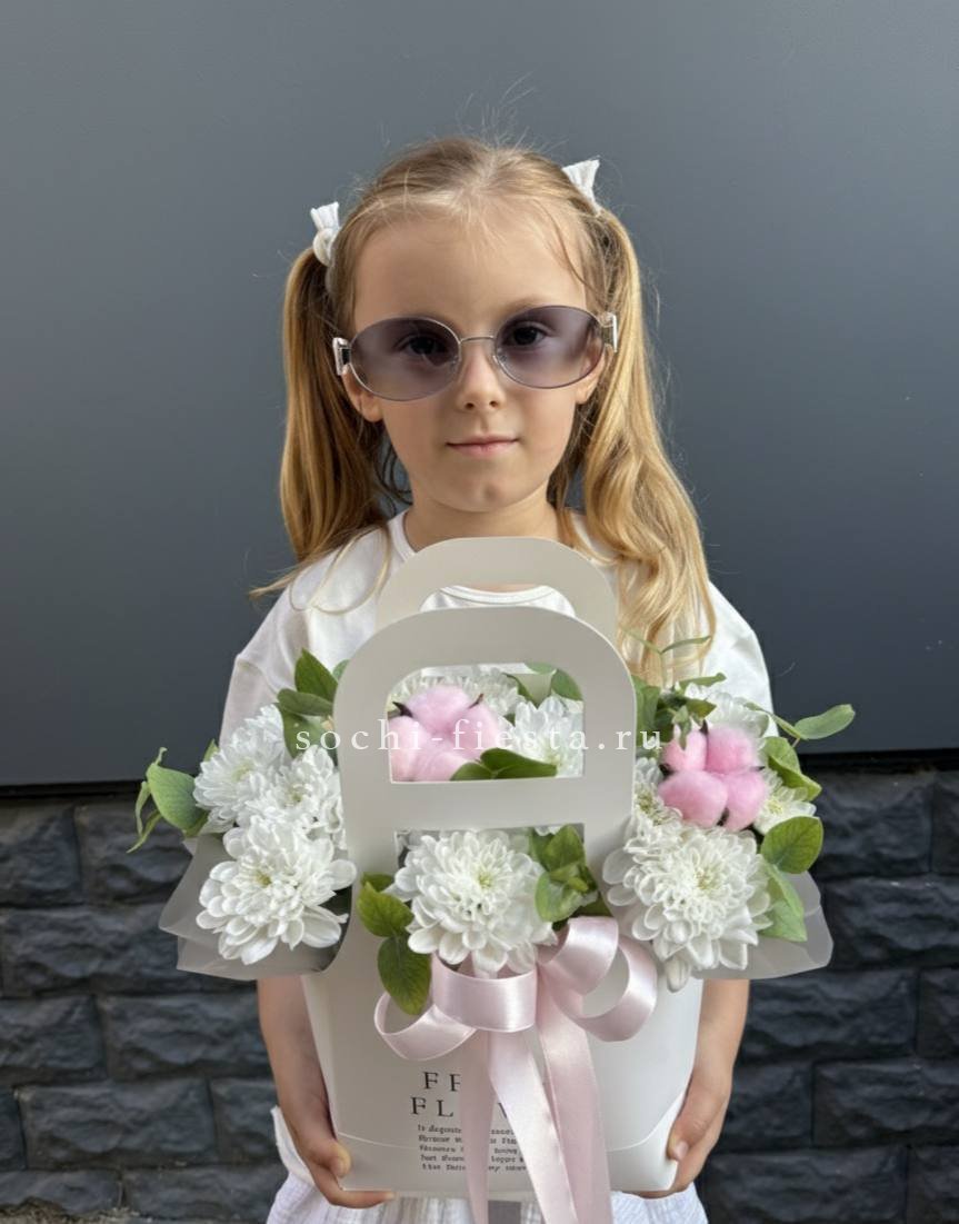 Французские розы собраны в аккуратную форму и помещены в сумочку. Компактная композиция легко помещается на столе или полке, сохраняя свежесть и опрятный вид.