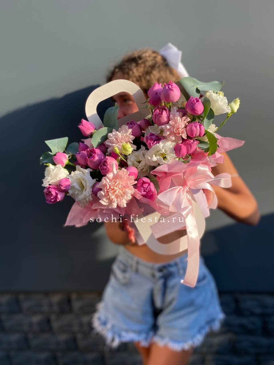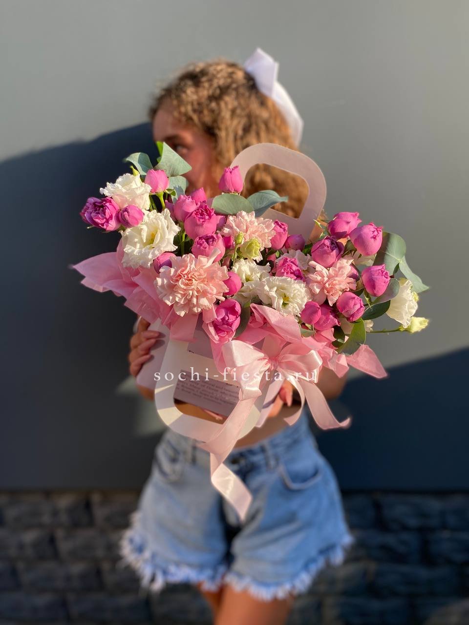 Для заказа товара "Сумочка с кустовой розой и диантусами" с доставкой в Нижнекамске нажмите в корзину