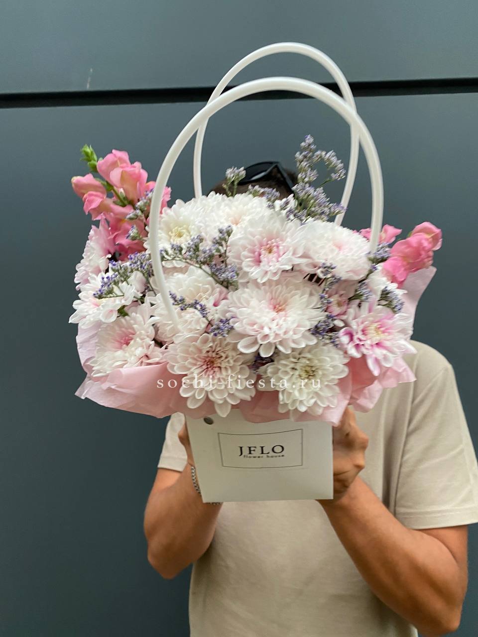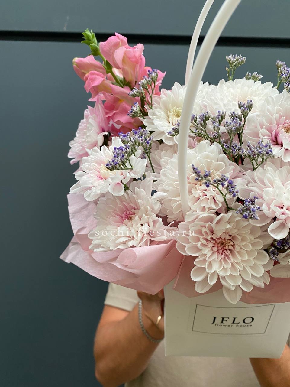 Первый взгляд цепляется за игру фактур: плотные головки гербер соседствуют с воздушными соцветиями мисти баблс и гортензии. Озотамнус добавляет графичные точки между крупными бутонами.