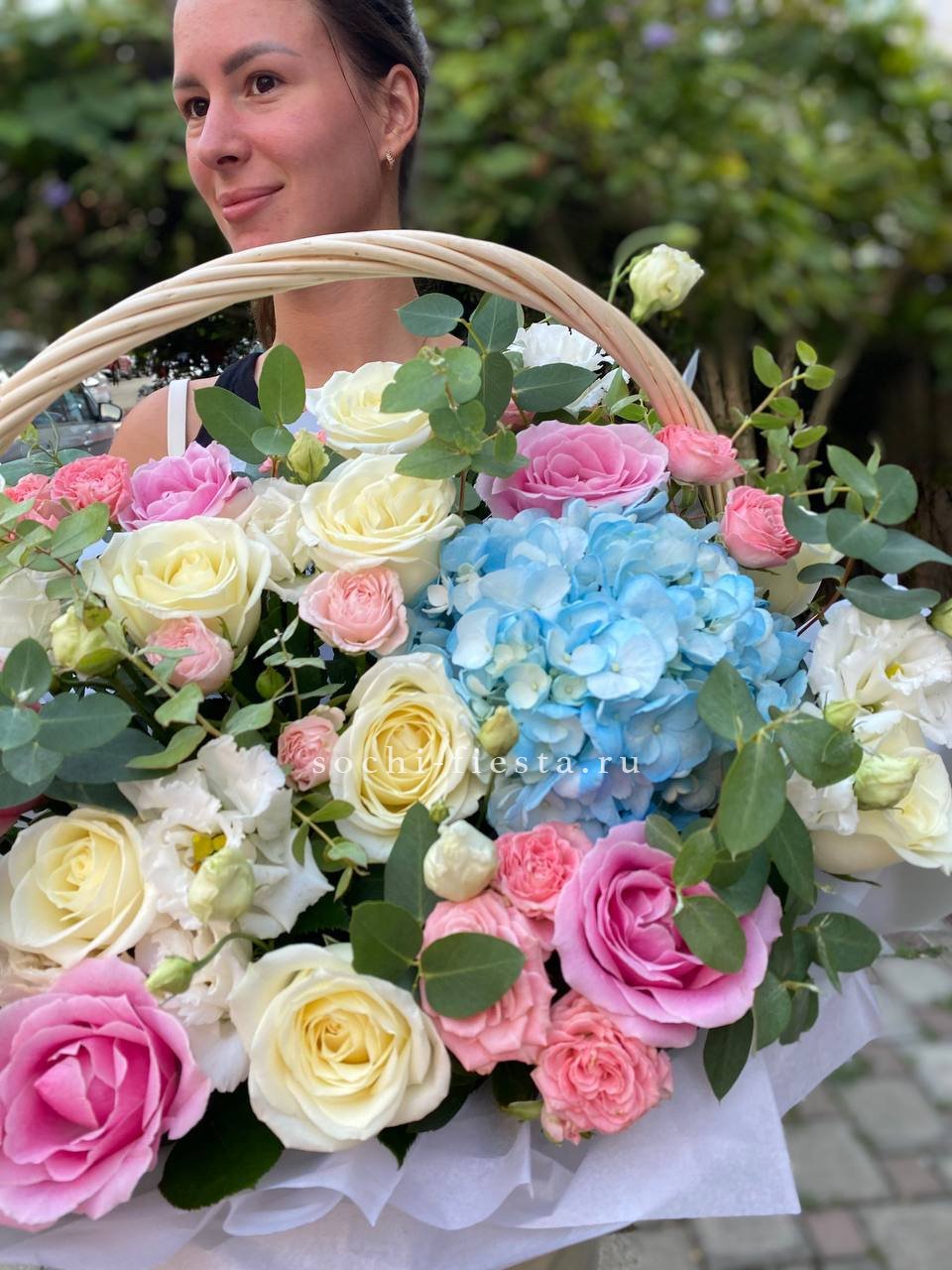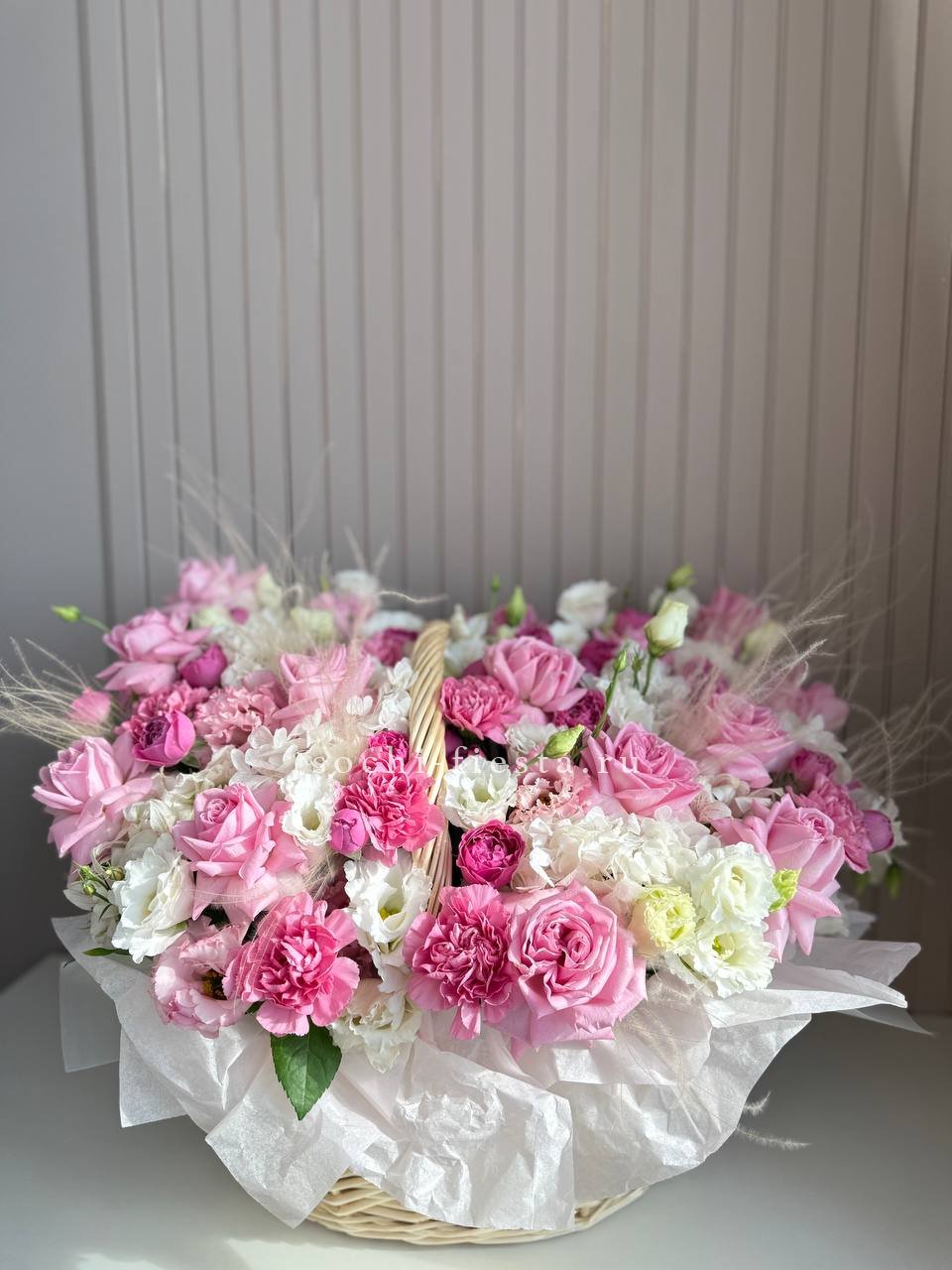 65 пионовидных кустовых роз Misty Bubbles, эвкалипт, светлая корзина.