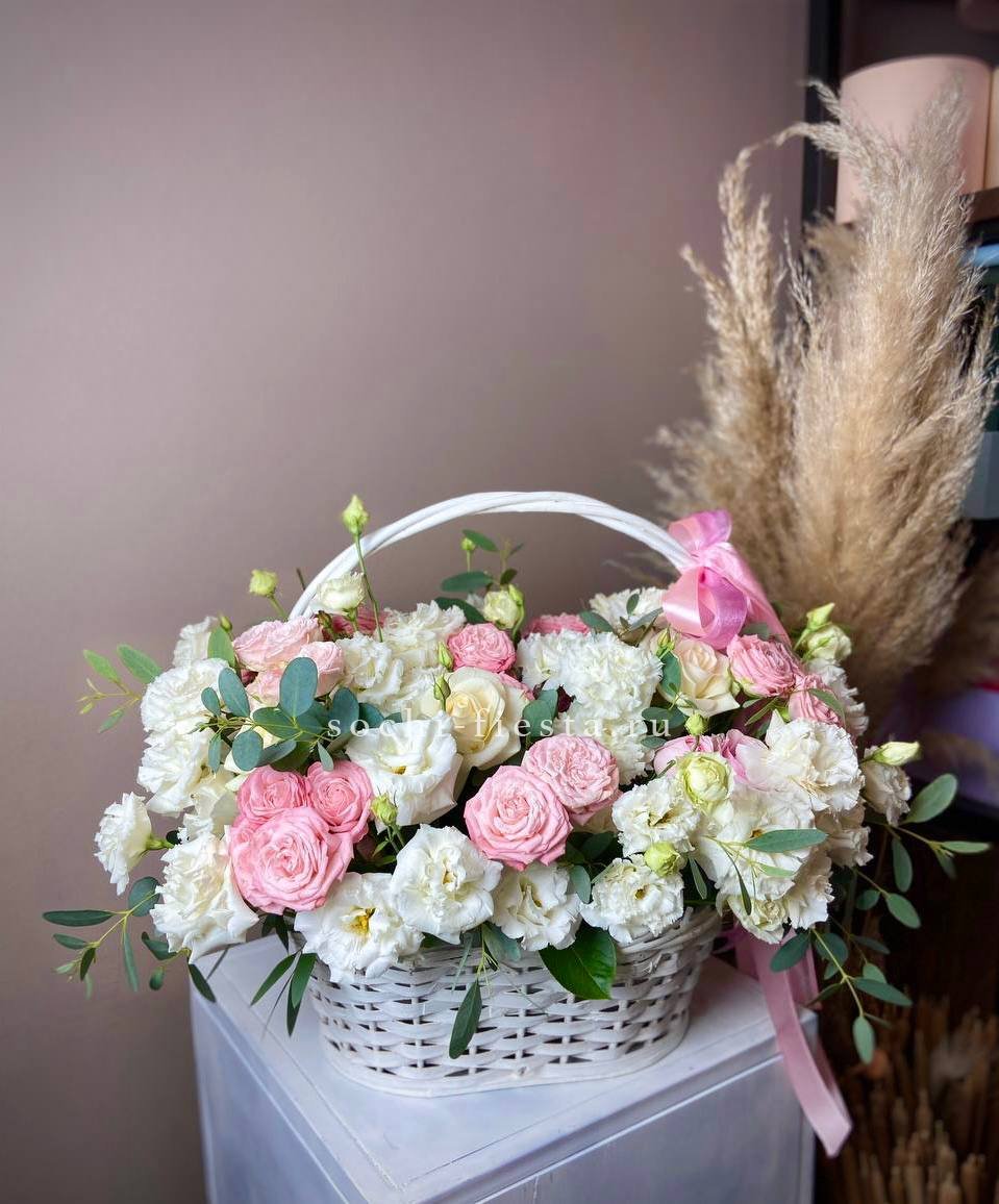 Корзина вмещает двести один бутон, образующих пышное цветочное полотно. Классическая форма подачи позволяет разместить композицию в любом пространстве без необходимости искать вазу. Впечатляющий объем для важных событий.