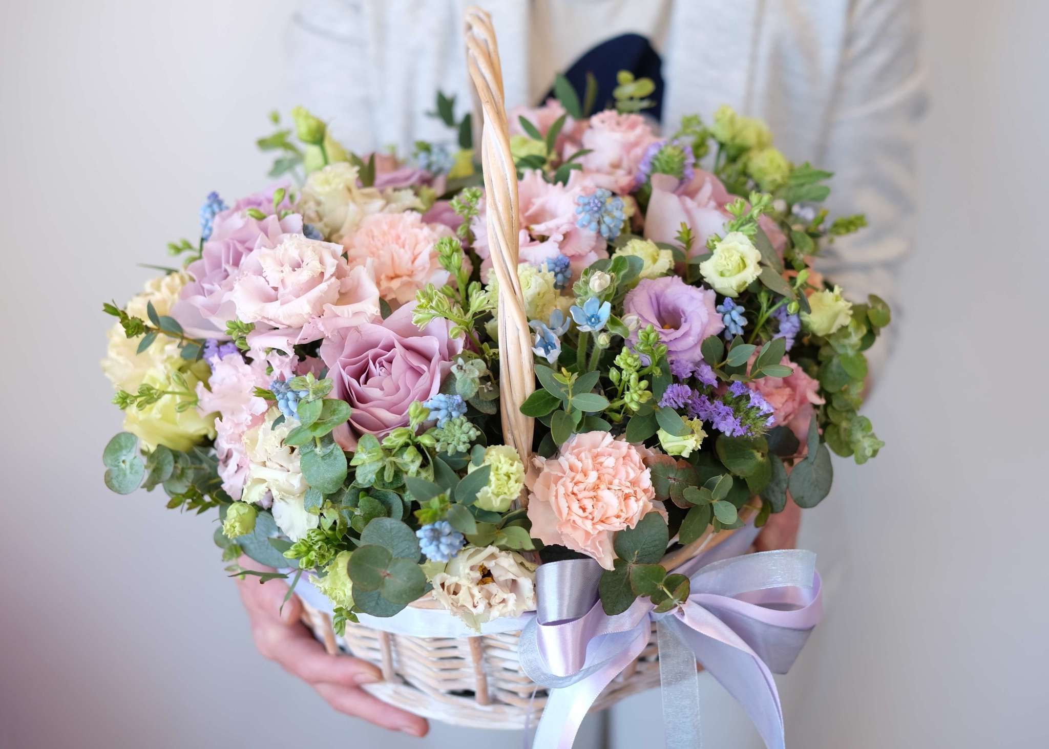 корзина выполнена в нежно-сиреневых тонах с применением декоративной зелени Состав: диантусы, эустома, эвкалипт, декоративная зелень,розы лента, светлая корзина.