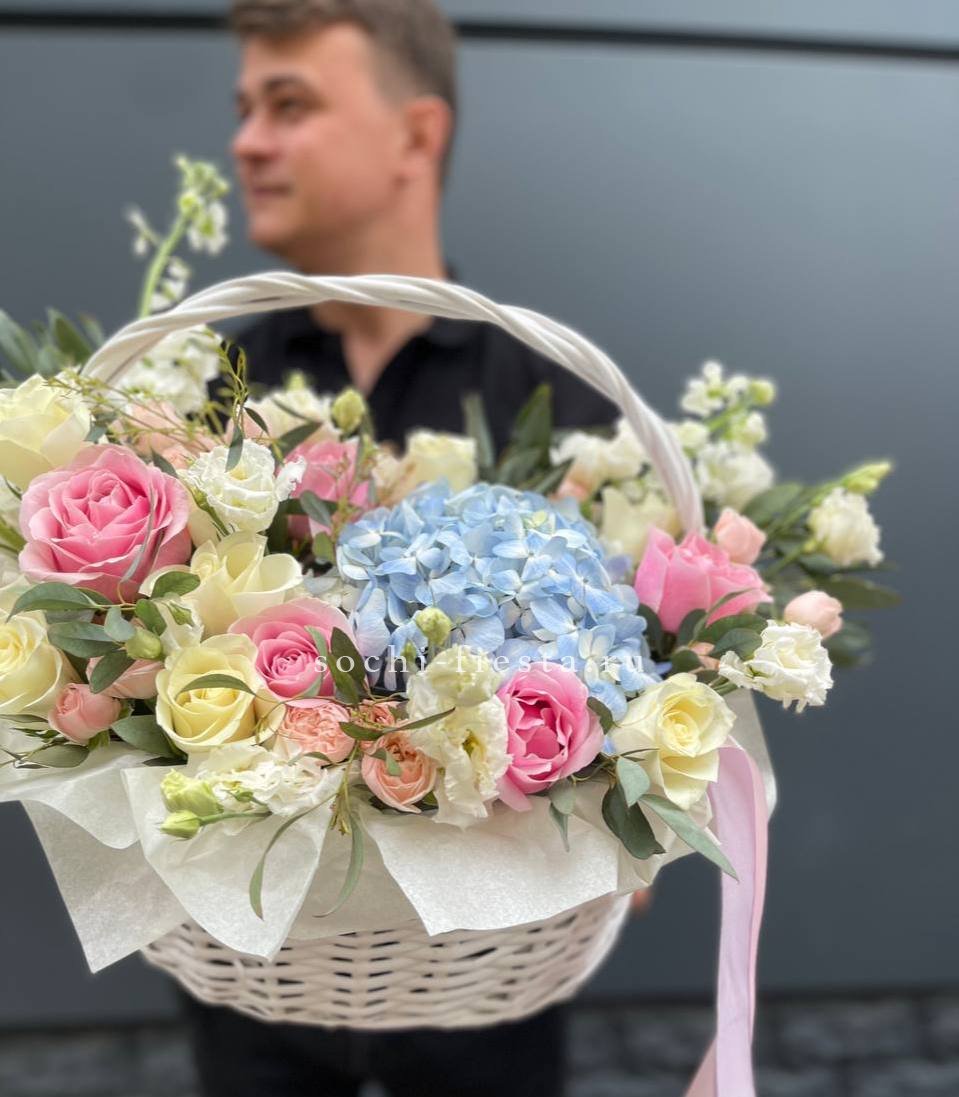 гортензия, эустома, розы, маттиола (дельфиниум или аналоги), кустовые розы, лента, корзина D40