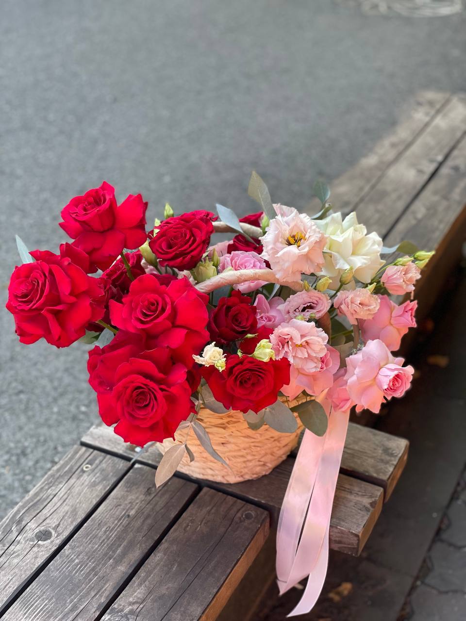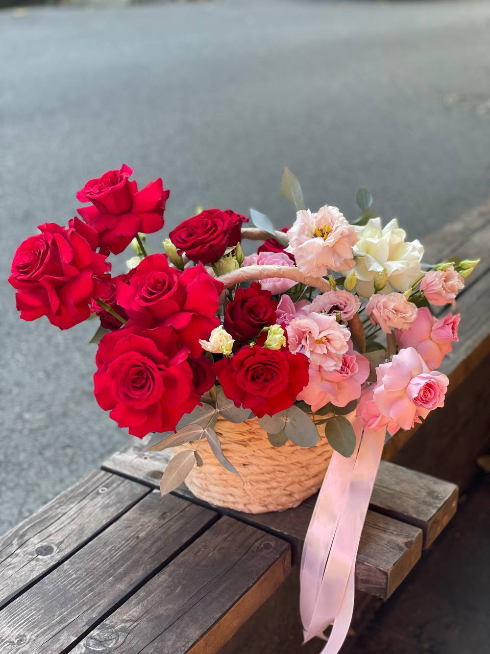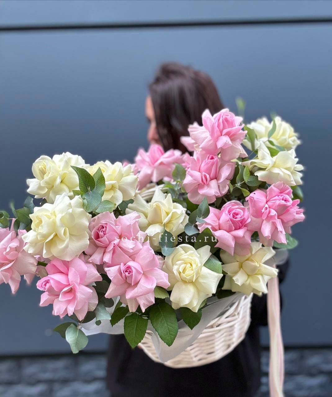 Пышная корзина с розами и гортензиями собрана плотно и объёмно. Маттиола добавляет живую текстуру между крупными соцветиями, а кустовые розы заполняют композицию мягкими переходами. Результат — впечатляющее присутствие, которое меняет восприятие пространства.