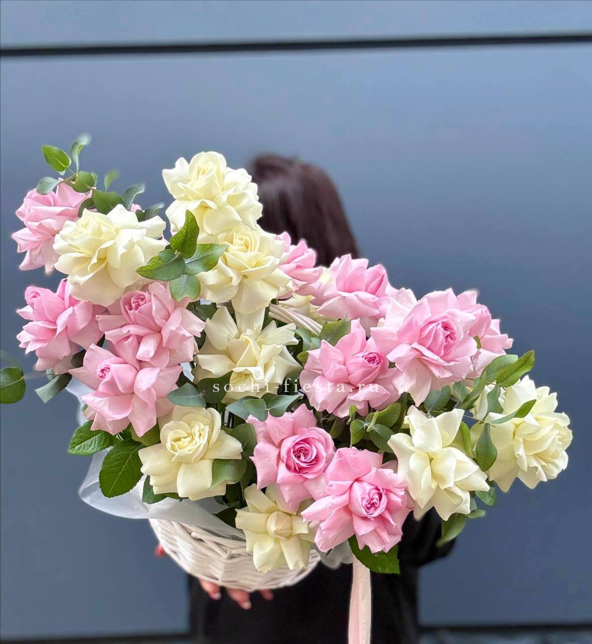 маттиола, гортензии, кустовые розы, розовые розы в корзине.