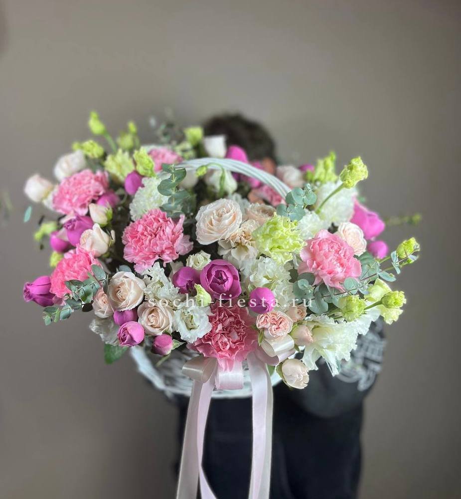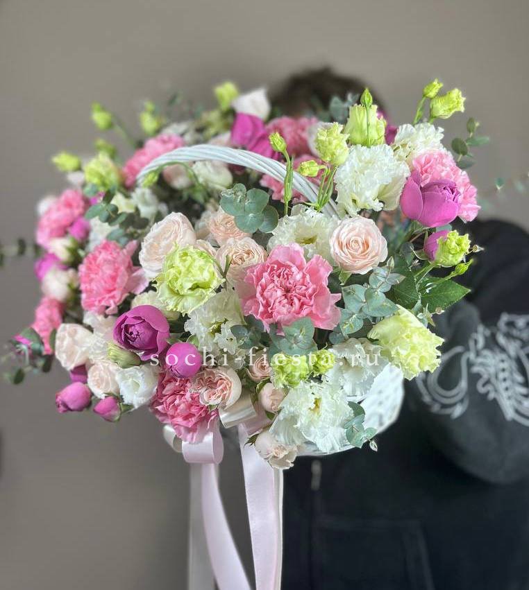 Плотная сферическая форма из пышных бутонов создаёт объёмную композицию в плетёной корзине. Ветки эвкалипта добавляют воздушности между головками цветов. Классическое решение для яркого события или знакового дня в жизни близкого человека.