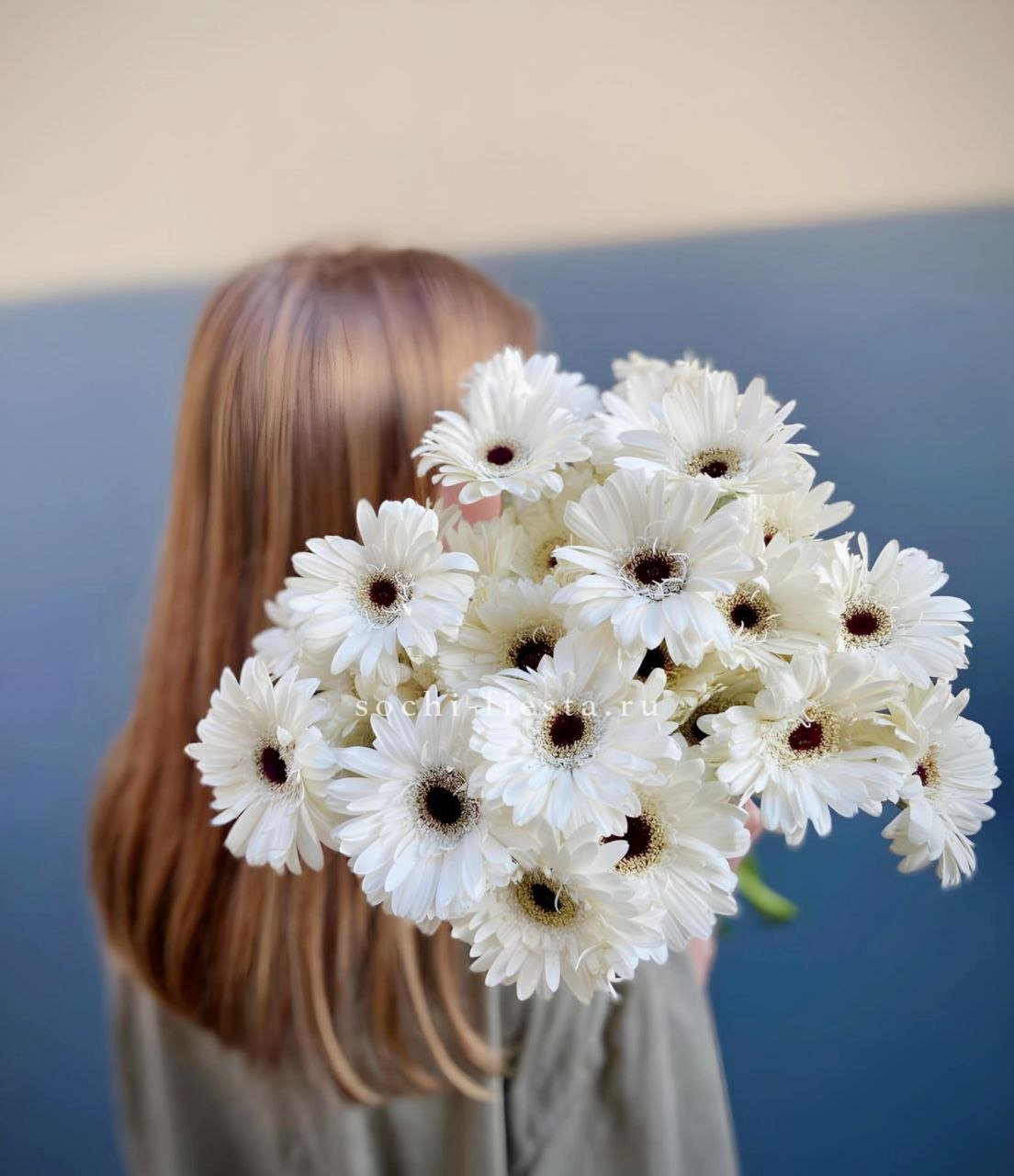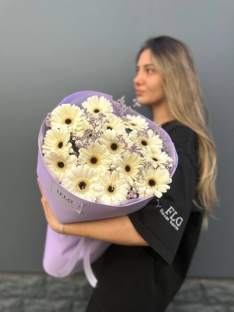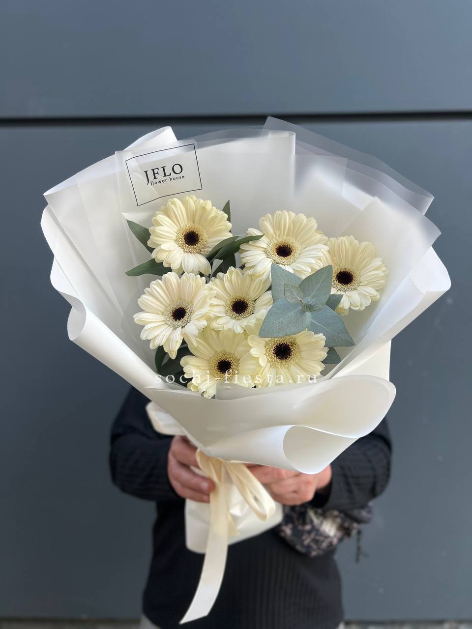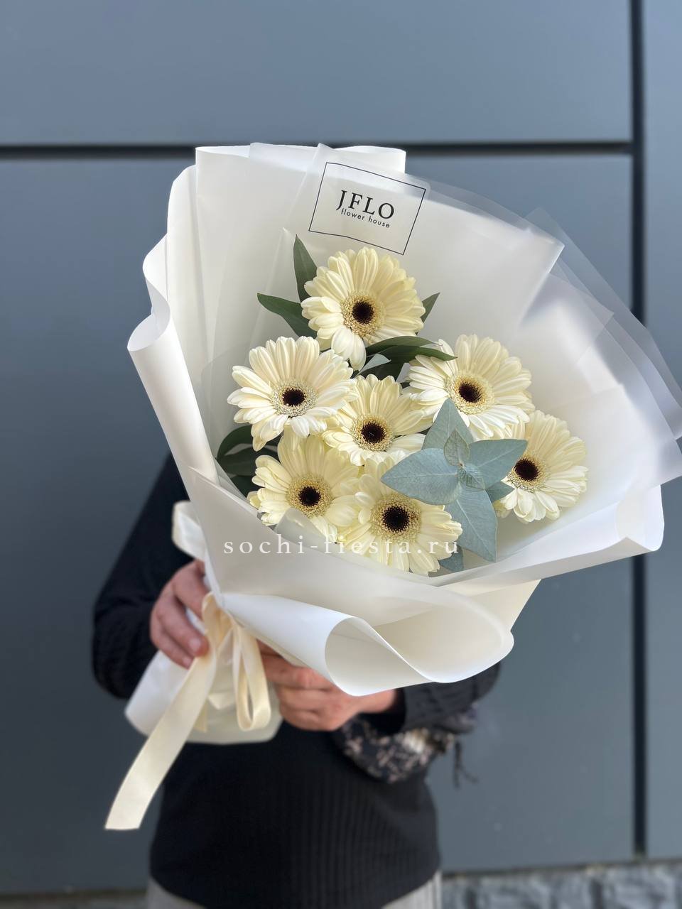 Семь голландских гербер собраны в лаконичный букет, где цвет можно выбрать по настроению. Крупные бутоны с чёткой графикой лепестков держат форму долго и радуют насыщенностью оттенка.