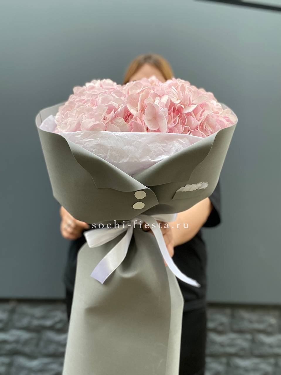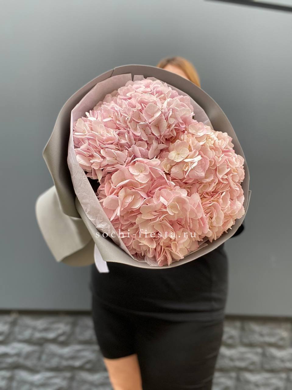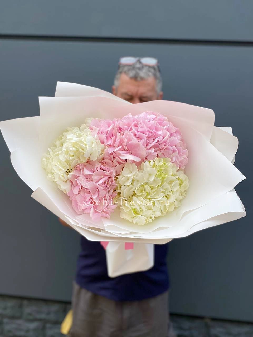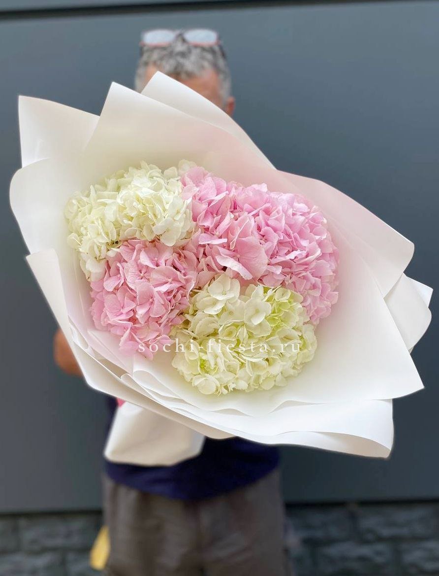 Двадцать пять соцветий гортензий разных оттенков формируют пышное облако с естественной игрой цвета. Каждая головка раскрывается по-своему, создавая живую фактуру без четких границ между тонами.