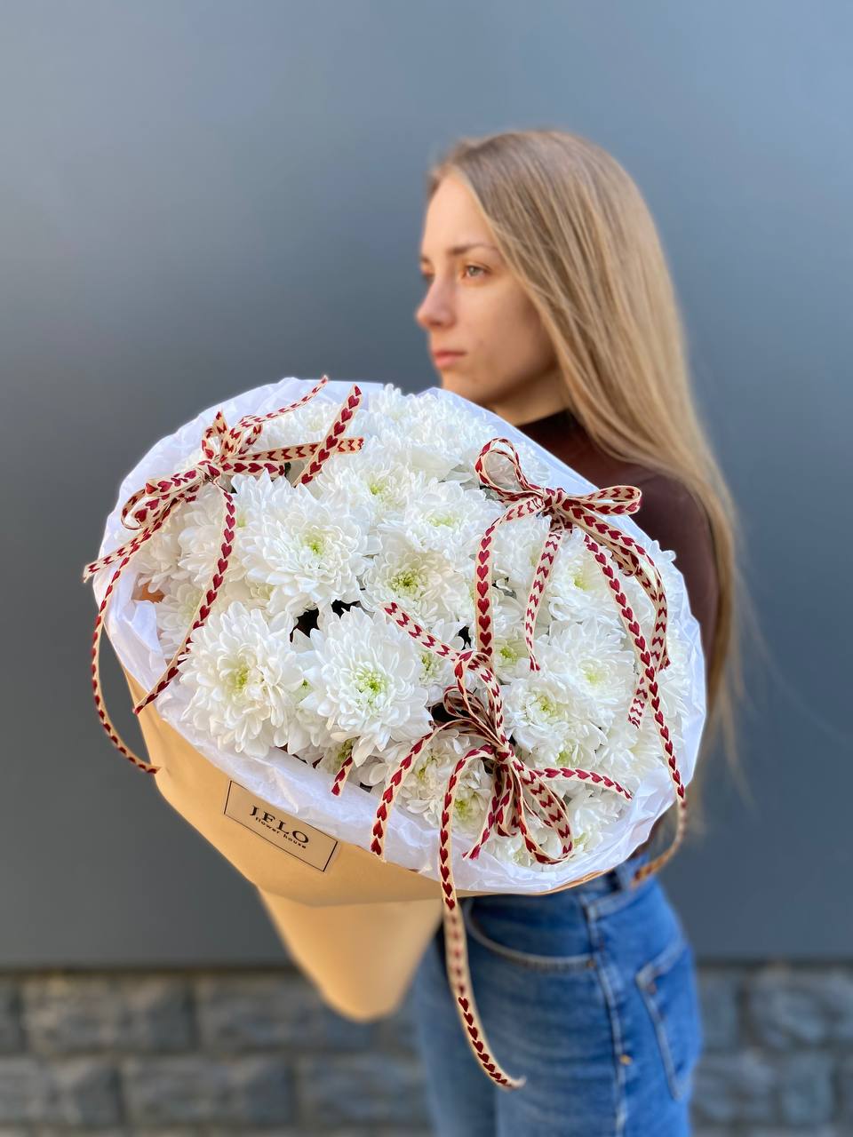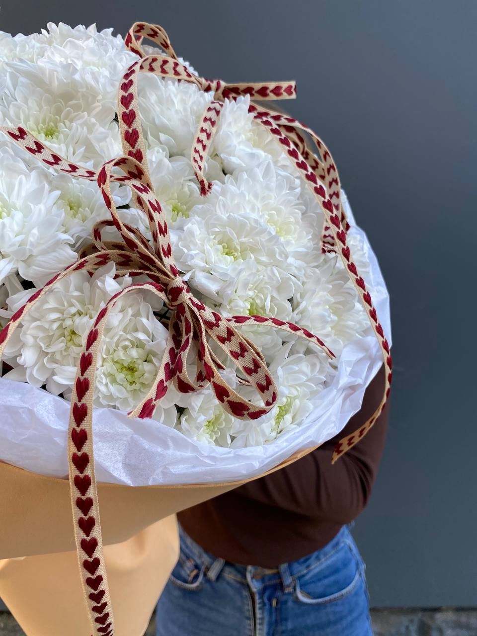 Пятнадцать веток кустовых хризантем с множеством бутонов создают пышную композицию с воздушной фактурой. Оформление из фоамирана добавляет букету завершенность и мягкий силуэт.