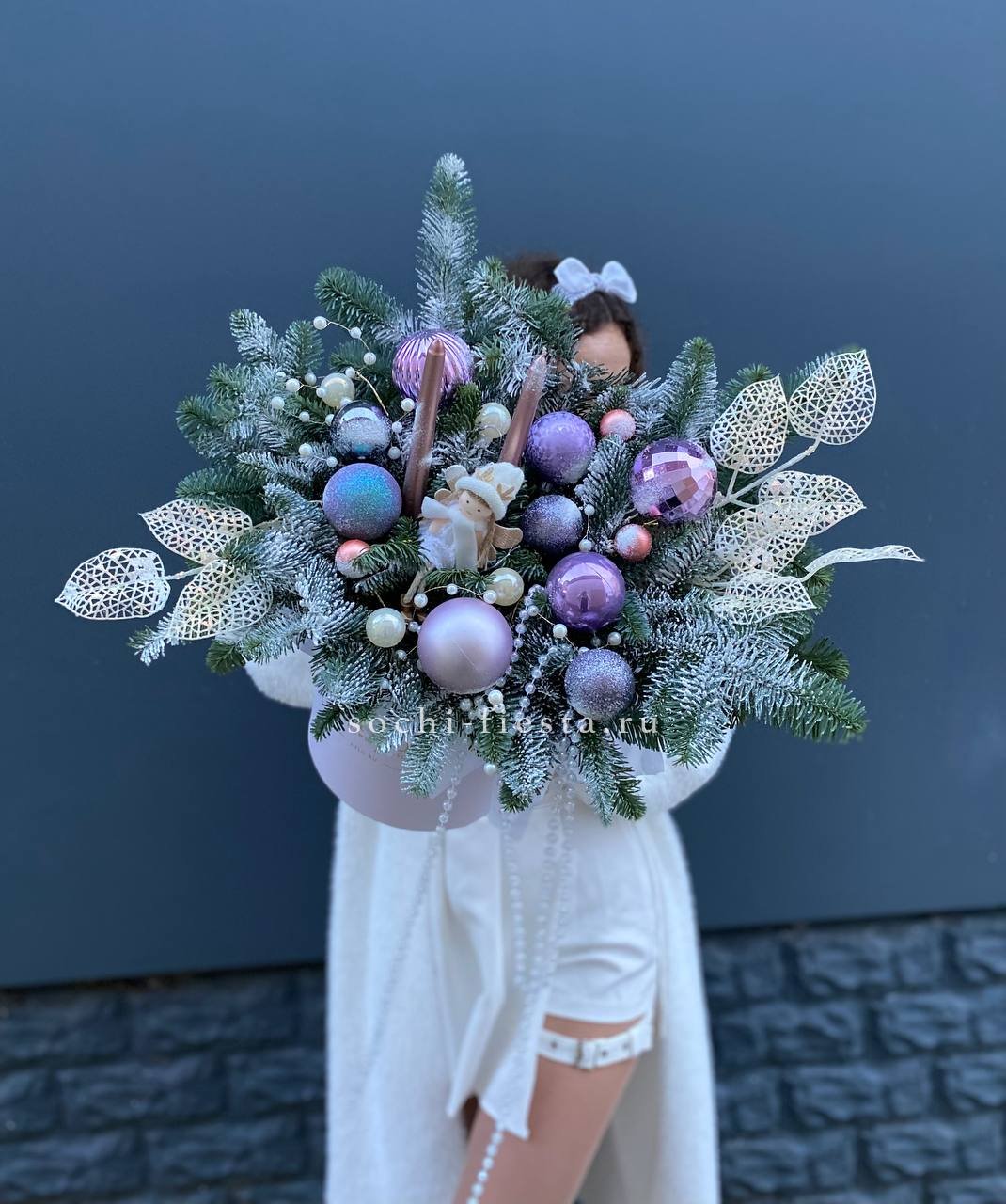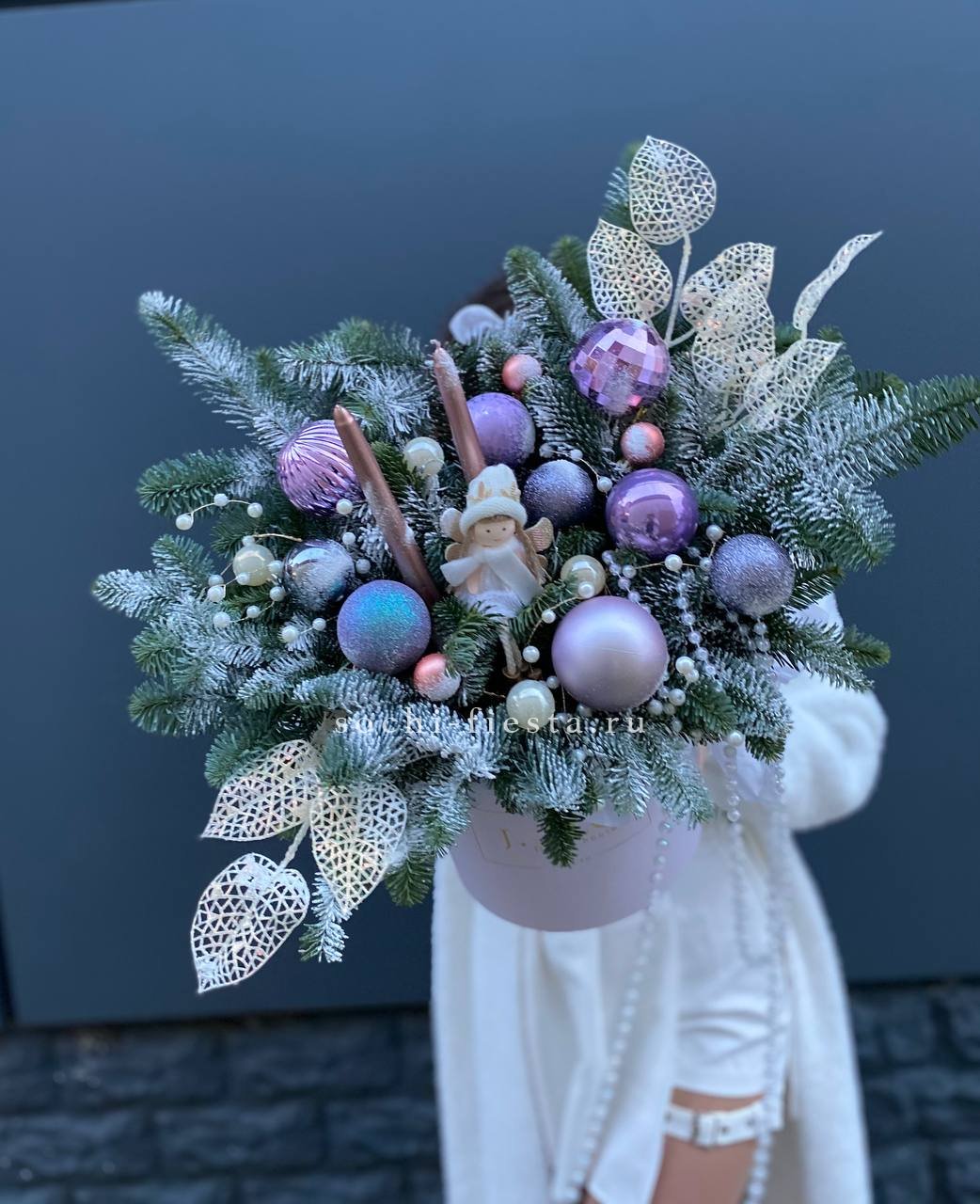 Ветки нобилиса обрамляют свечи и новогодние игрушки, создавая вертикальный силуэт с плавными переходами. Композиция выстроена так, что взгляд движется от основания к верхушке. Форма держится плотно и аккуратно.