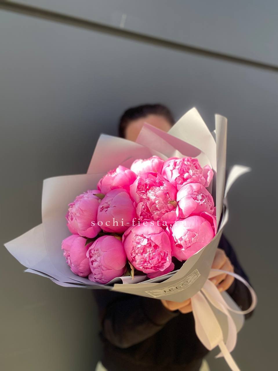 розовые пионы, лента, упаковка.