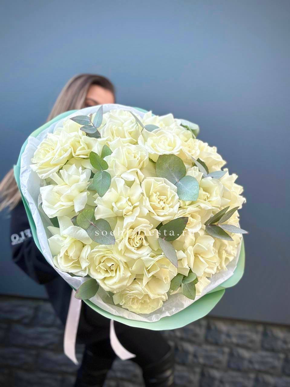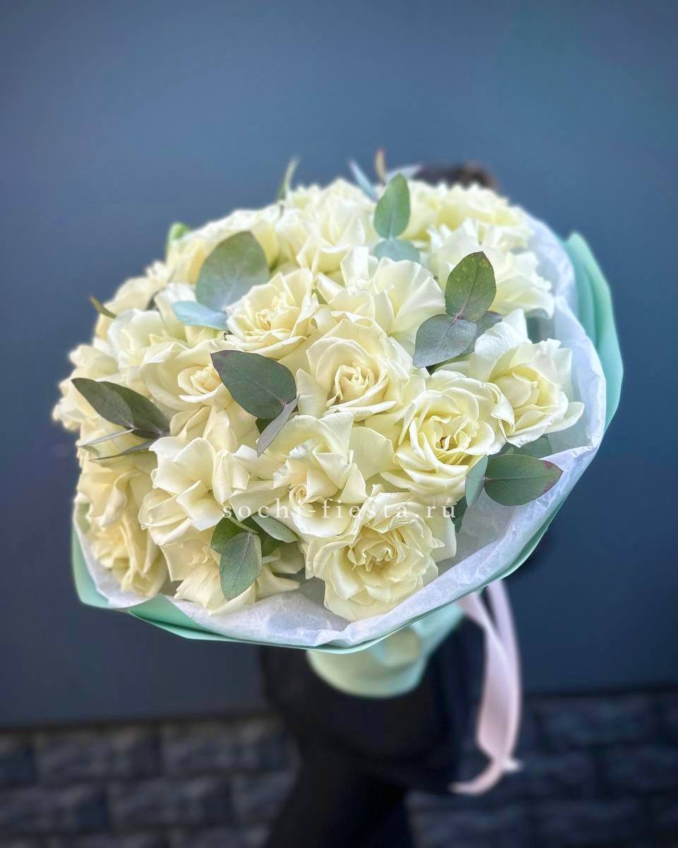 Пятьдесят один бутон выстраиваются в объёмную сферу с чёткой геометрией. Белые розы держат форму и создают ощутимое визуальное присутствие. Букет занимает пространство уверенно и спокойно.