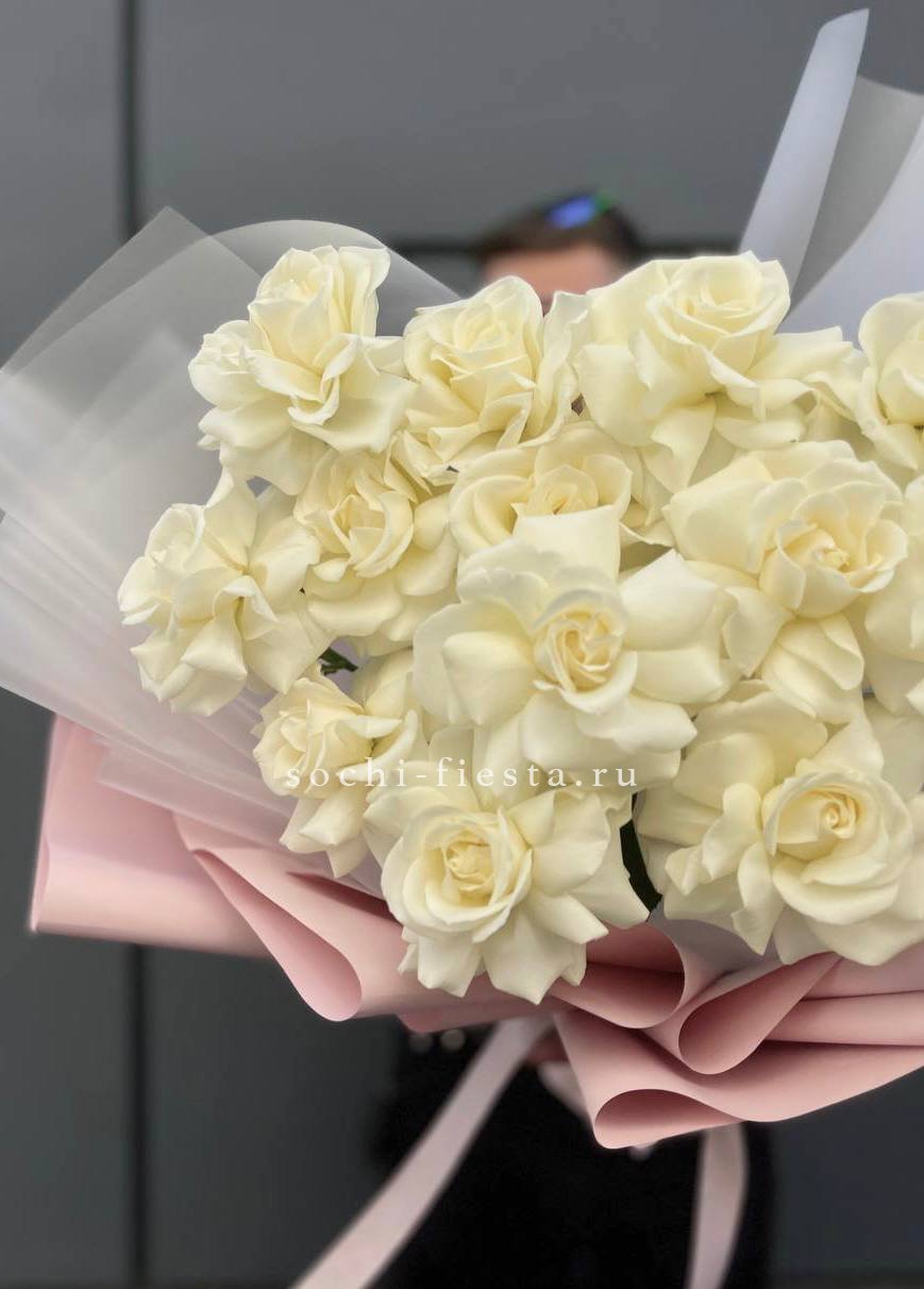 Пятнадцать вывернутых роз White Dream раскрываются широкими головками с волнистыми лепестками. Белый цвет переливается от молочного до холодного снежного оттенка.