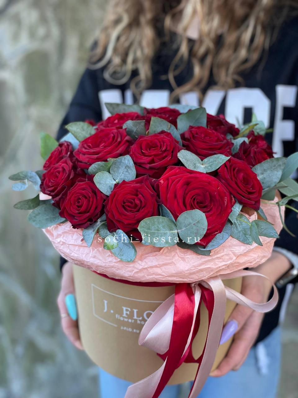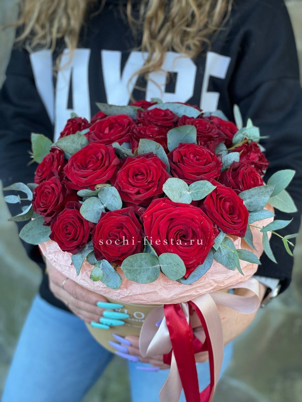 Сто один бутон сорта Лолита раскрывается бархатными лепестками глубокого красного цвета. Высокие стебли формируют объемную композицию с выразительным силуэтом. Классика в современной подаче.