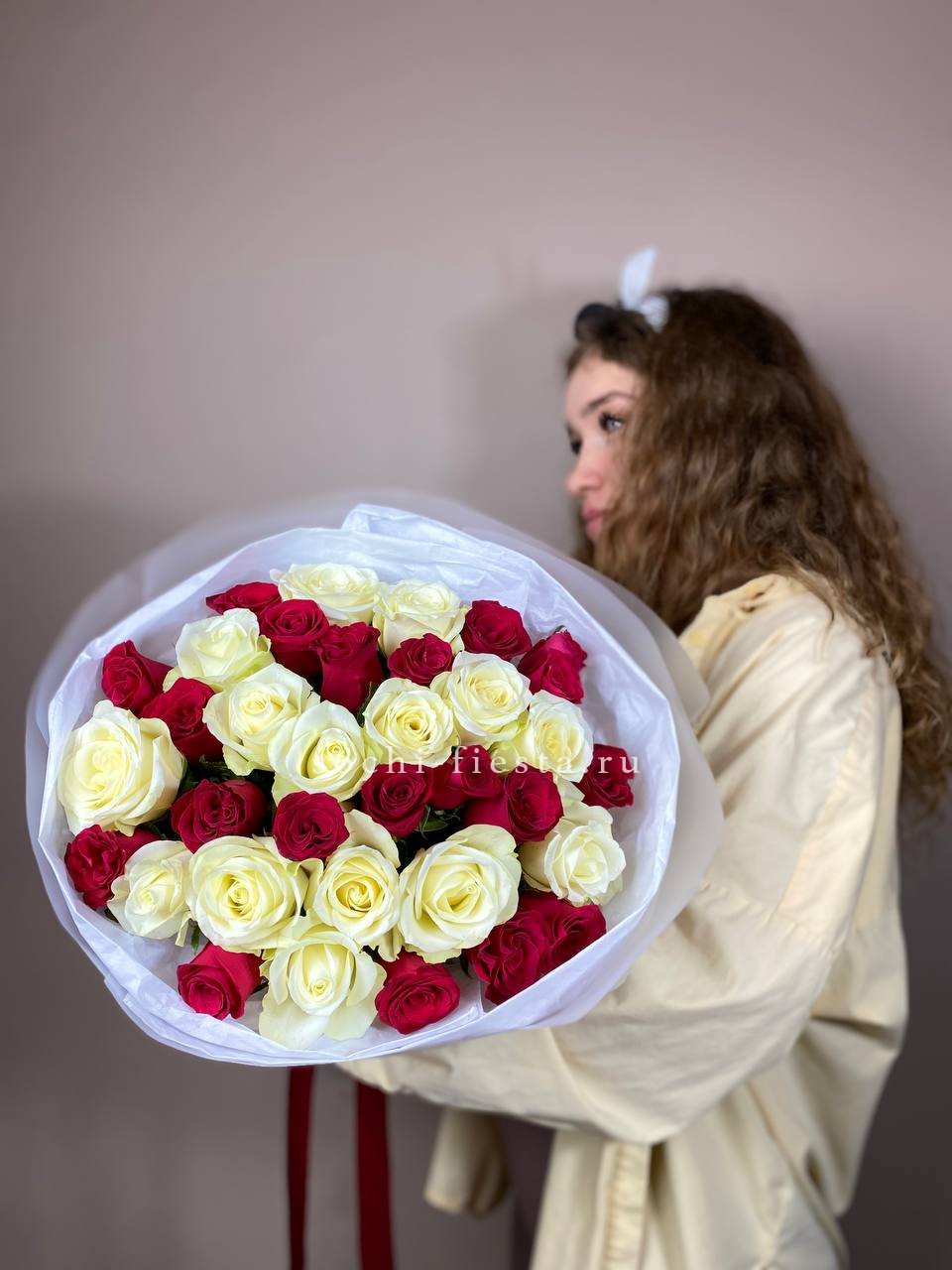 Для заказа товара "Букет из красных белых 35 роз" с доставкой в Нижнекамске нажмите в корзину