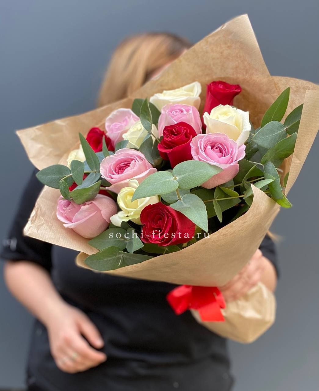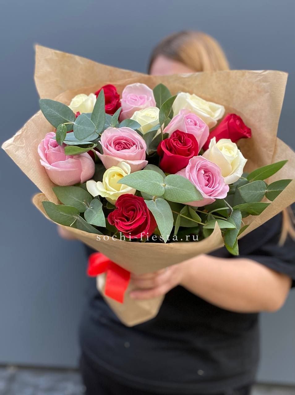 роза - 15 шт.,  фисташка или эвкалипт, лента, дизайнерская упаковка.