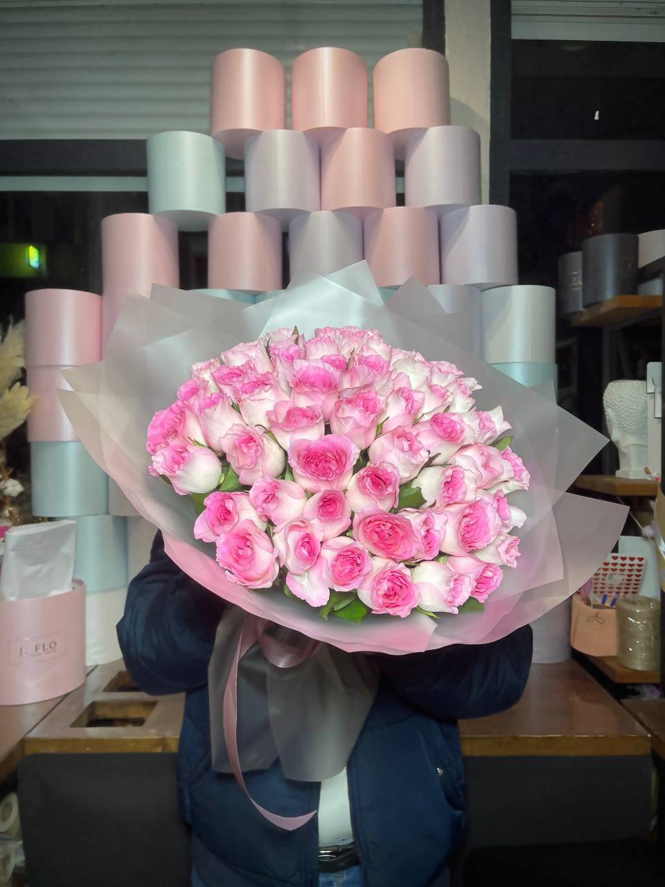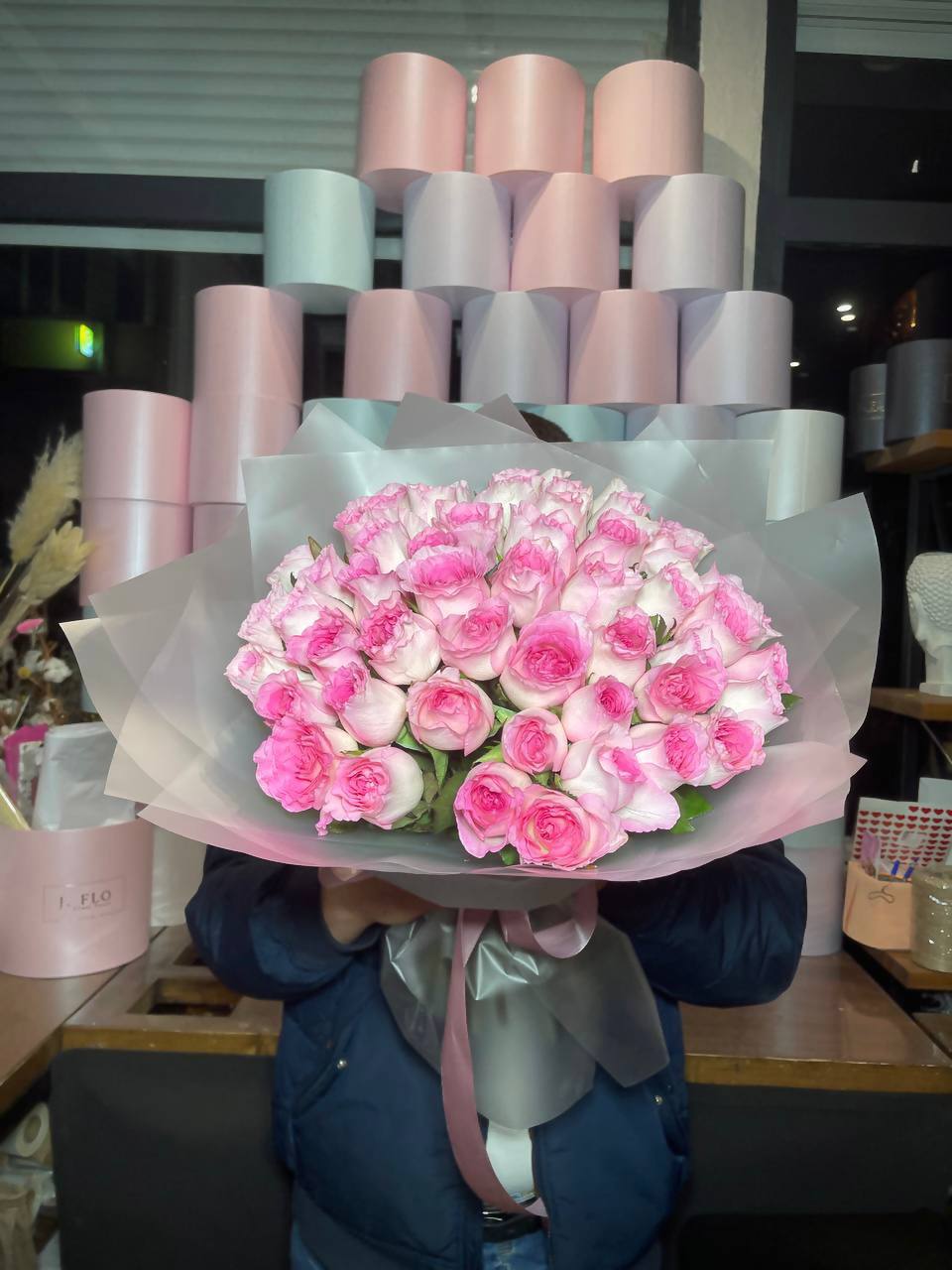 Тридцать одна роза образует пышное облако розового цвета с серебристыми нотами эвкалипта. Крафтовая обертка подчёркивает естественную красоту бутонов и создаёт ощущение лёгкости.