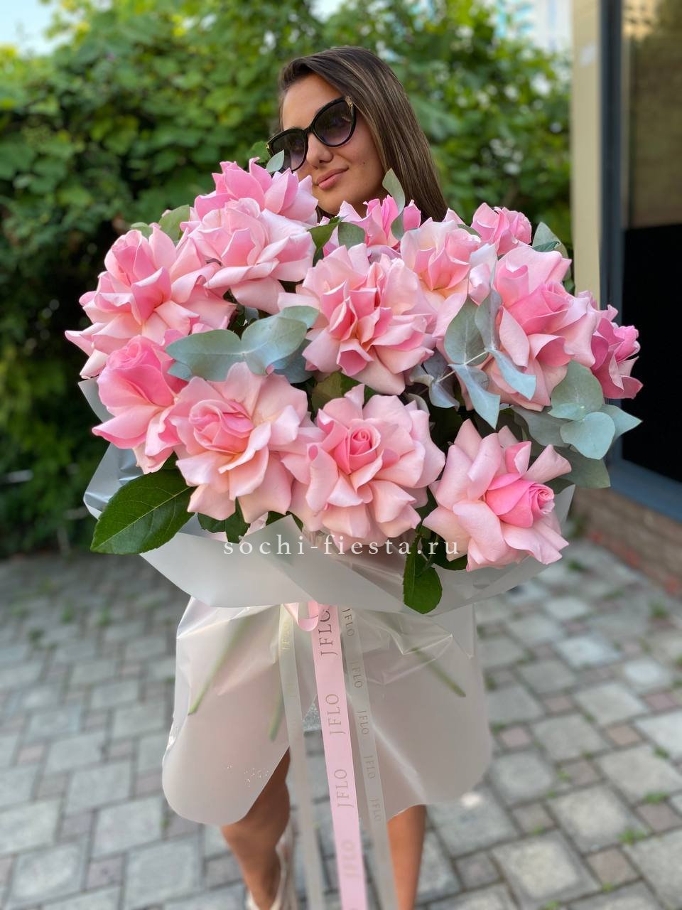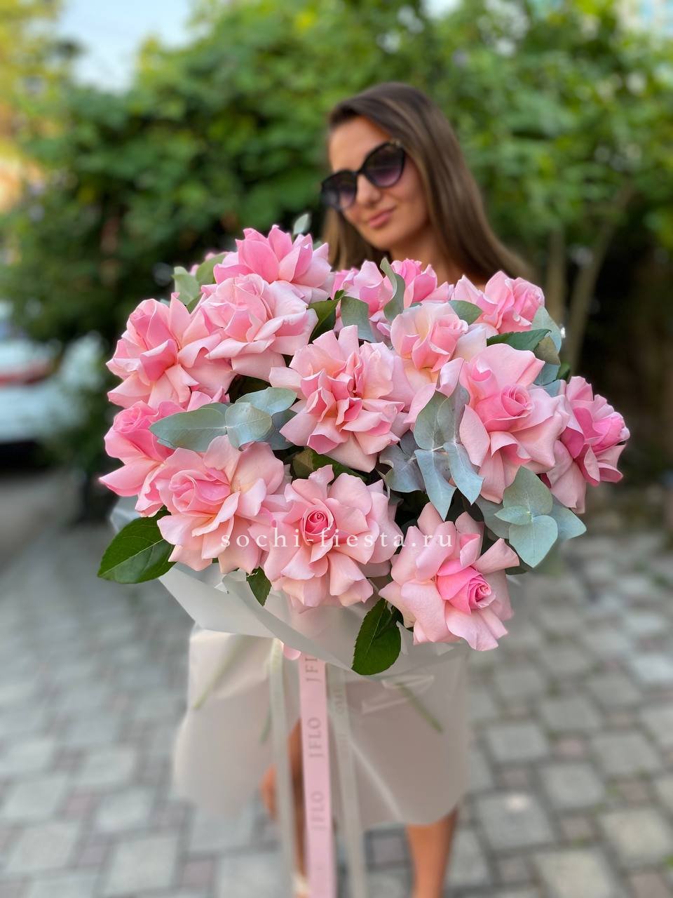 Розовые бутоны в обрамлении эвкалипта создают свежий летний образ. Тридцать три розы формируют объёмную композицию. Зелень добавляет воздушности и завершённости.
