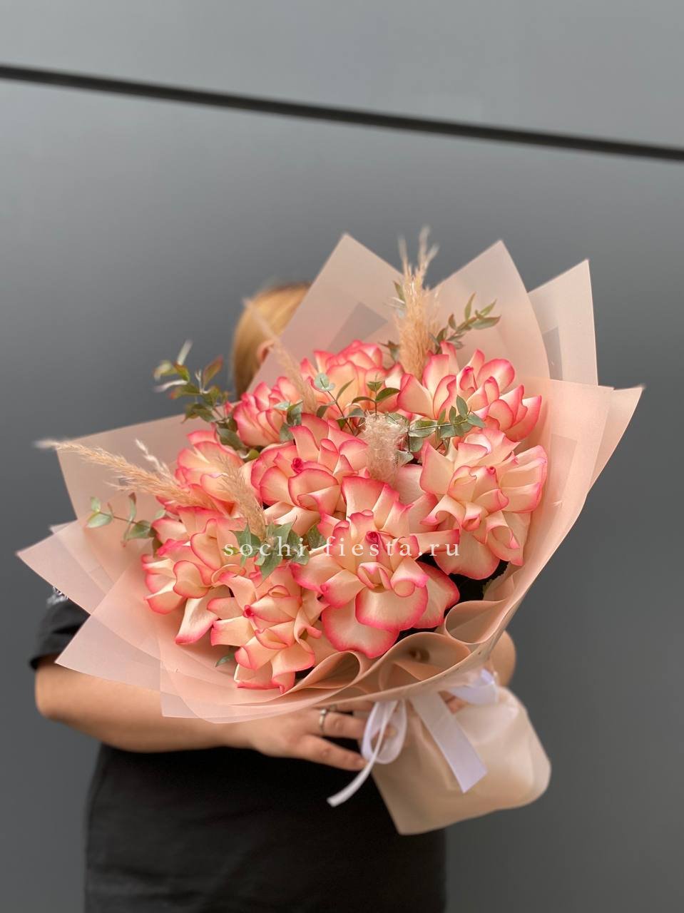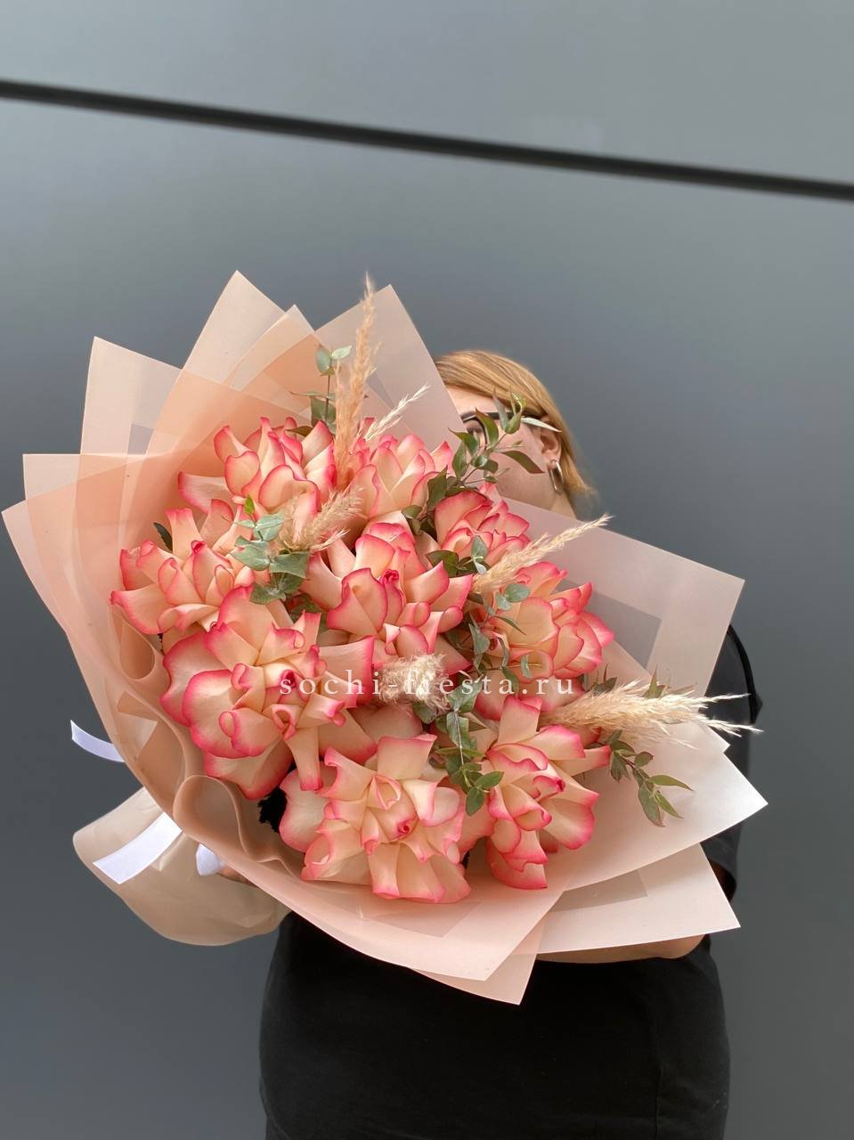 Девять французских роз с вывернутыми лепестками раскрывают всю глубину бутона. Пампасная трава добавляет воздушности и мягко обрамляет яркие головки Джумилии.