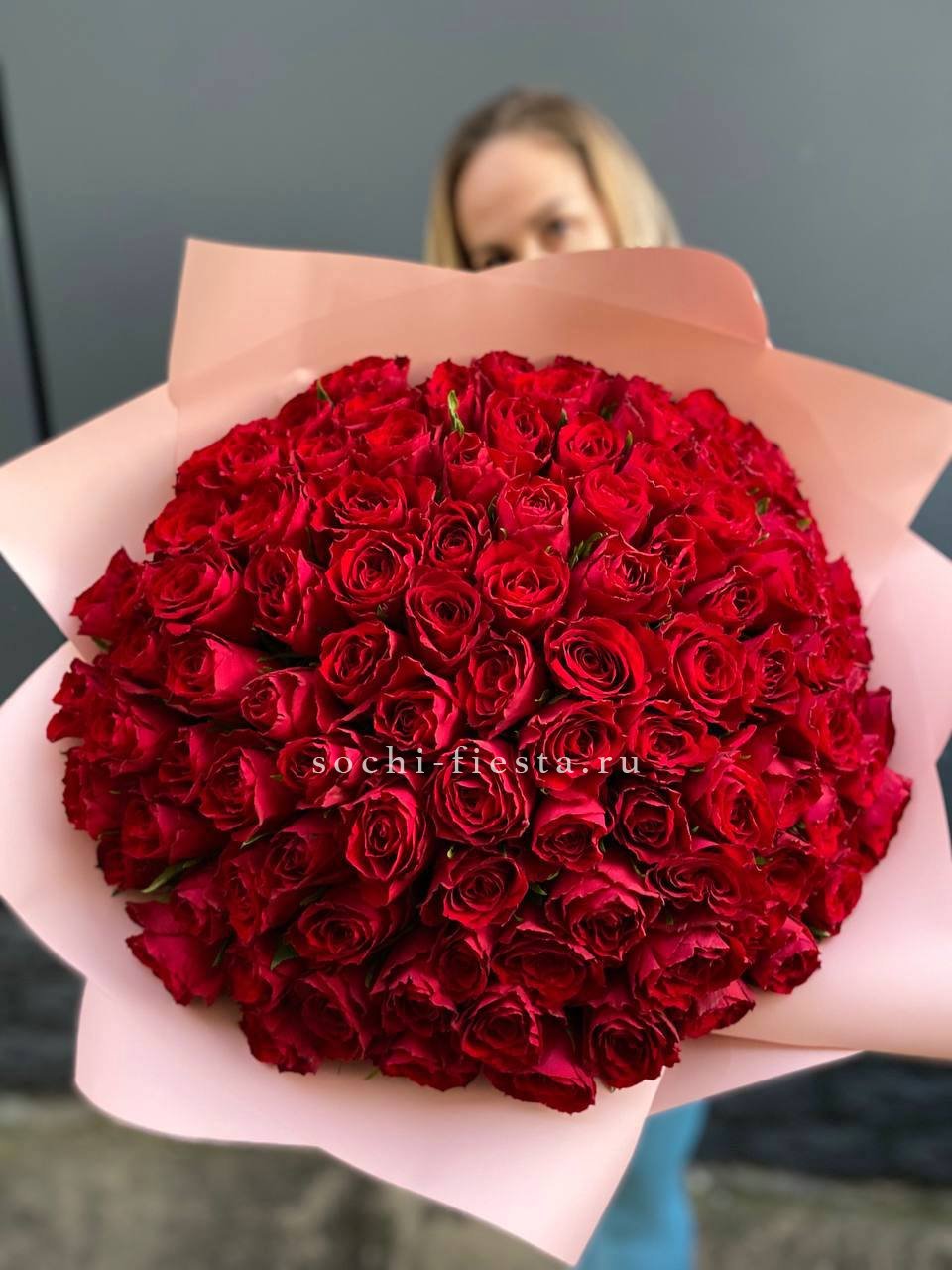 Сто одна красная роза хорошо сохраняет форму и долго радует свежестью бутонов. Плотная сборка обеспечивает аккуратный вид и удобство размещения в любом интерьере.