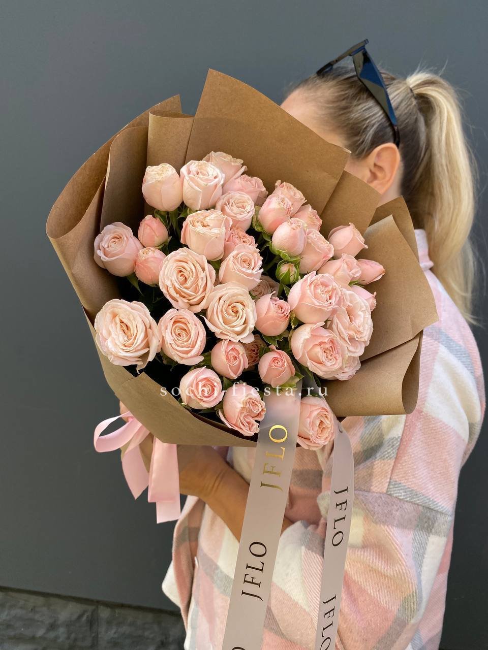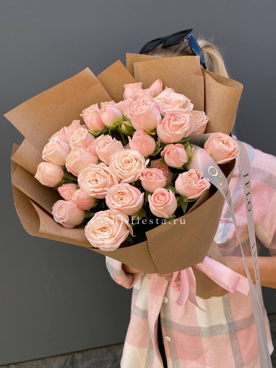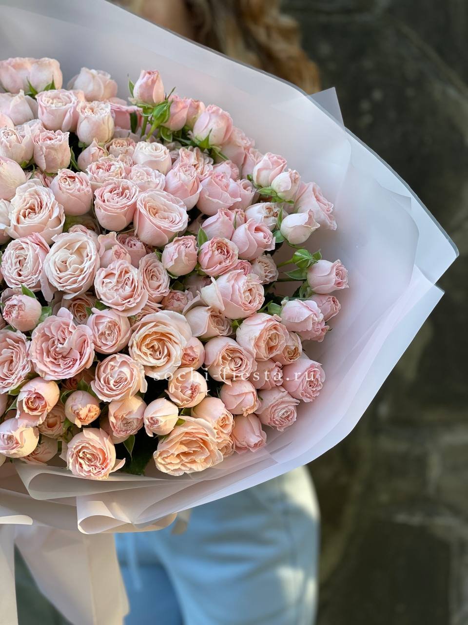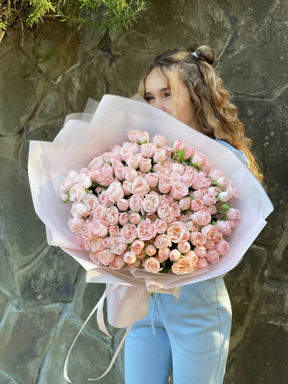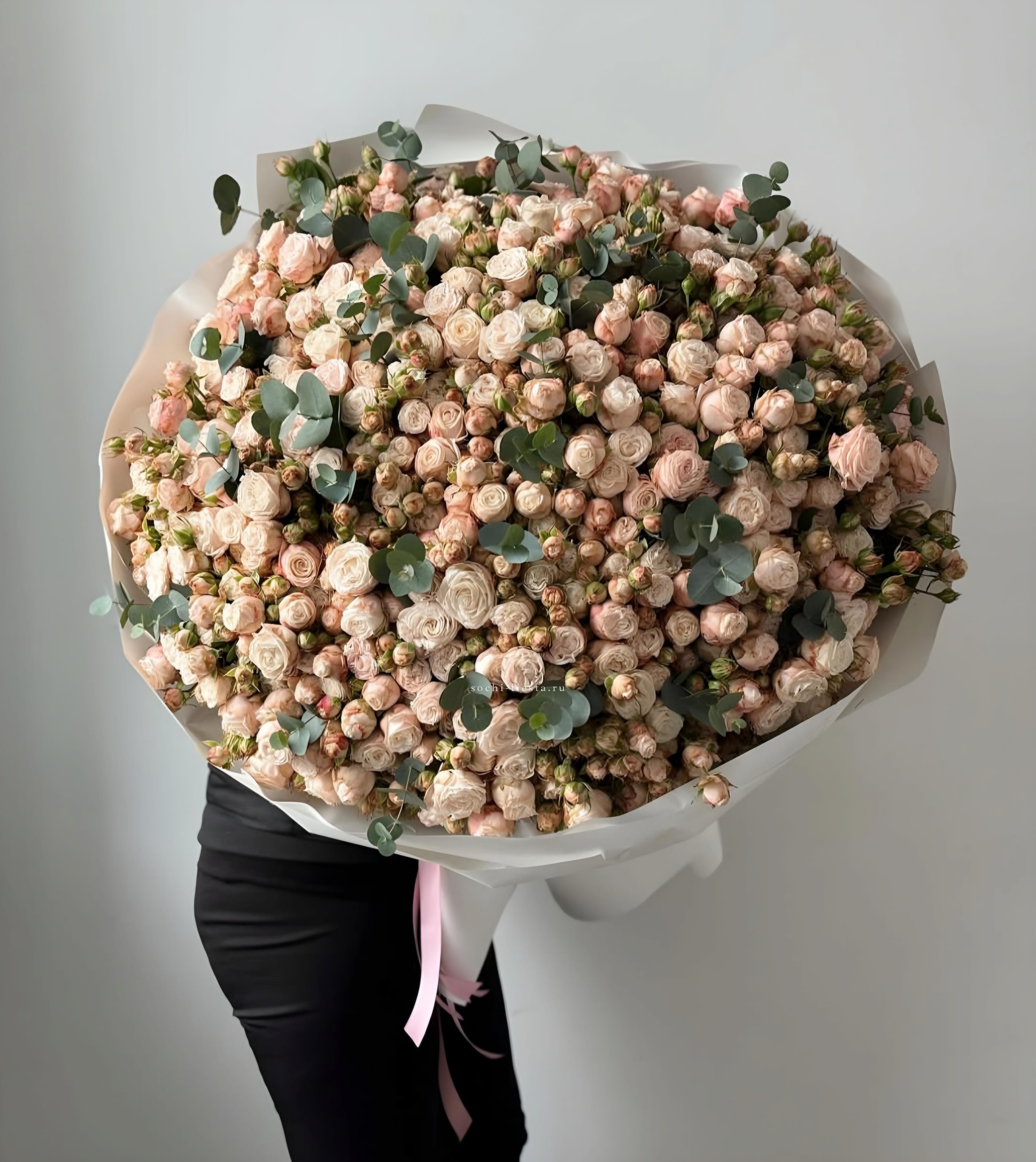 кустовые розы бомбастик, эвкалипт, пленка.