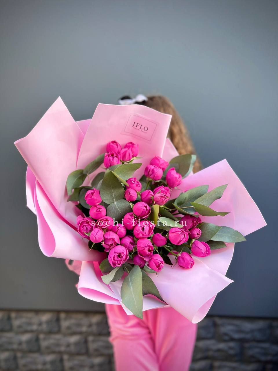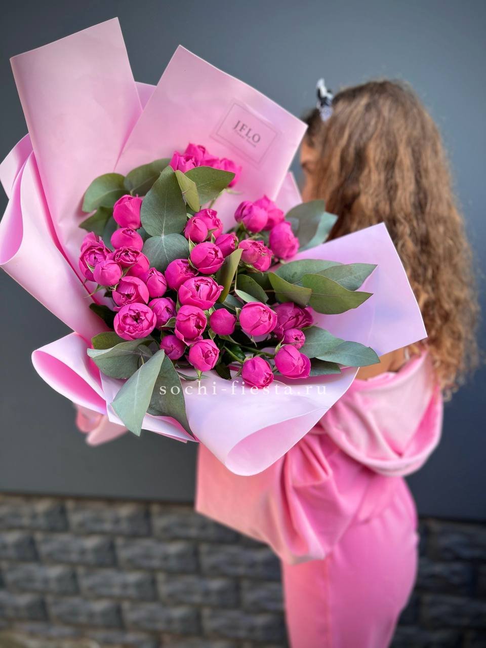 яркий букет из 13 пионовидных кустовых роз, лимониума и эвкалипта.