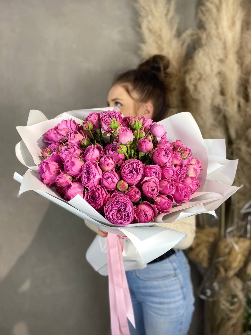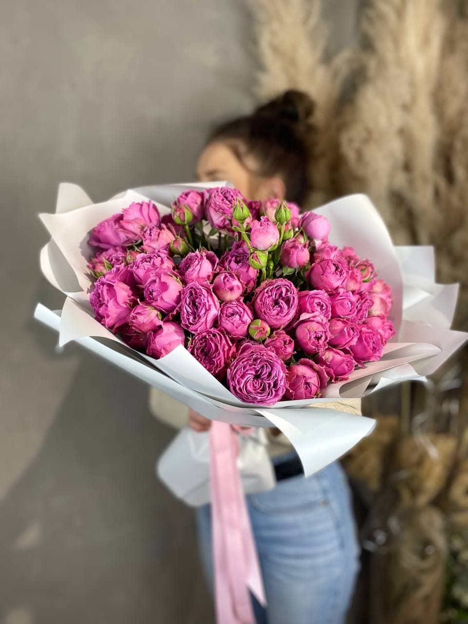 Девять кустовых роз собраны в компактную форму с мягким розовым оттенком. Множество небольших бутонов создают объемную текстуру и природную легкость. Букет упакован в матовую бумагу с лентой.